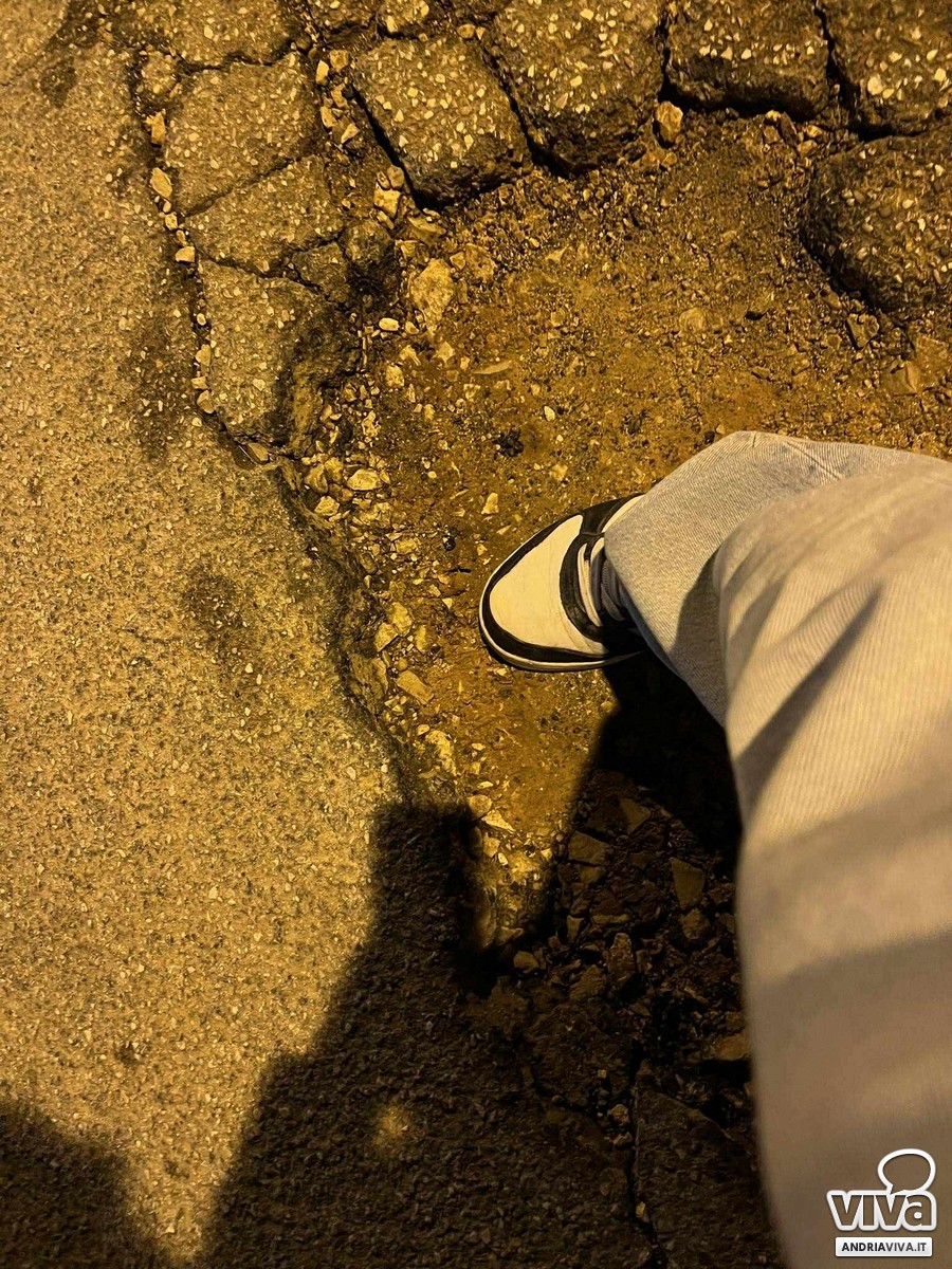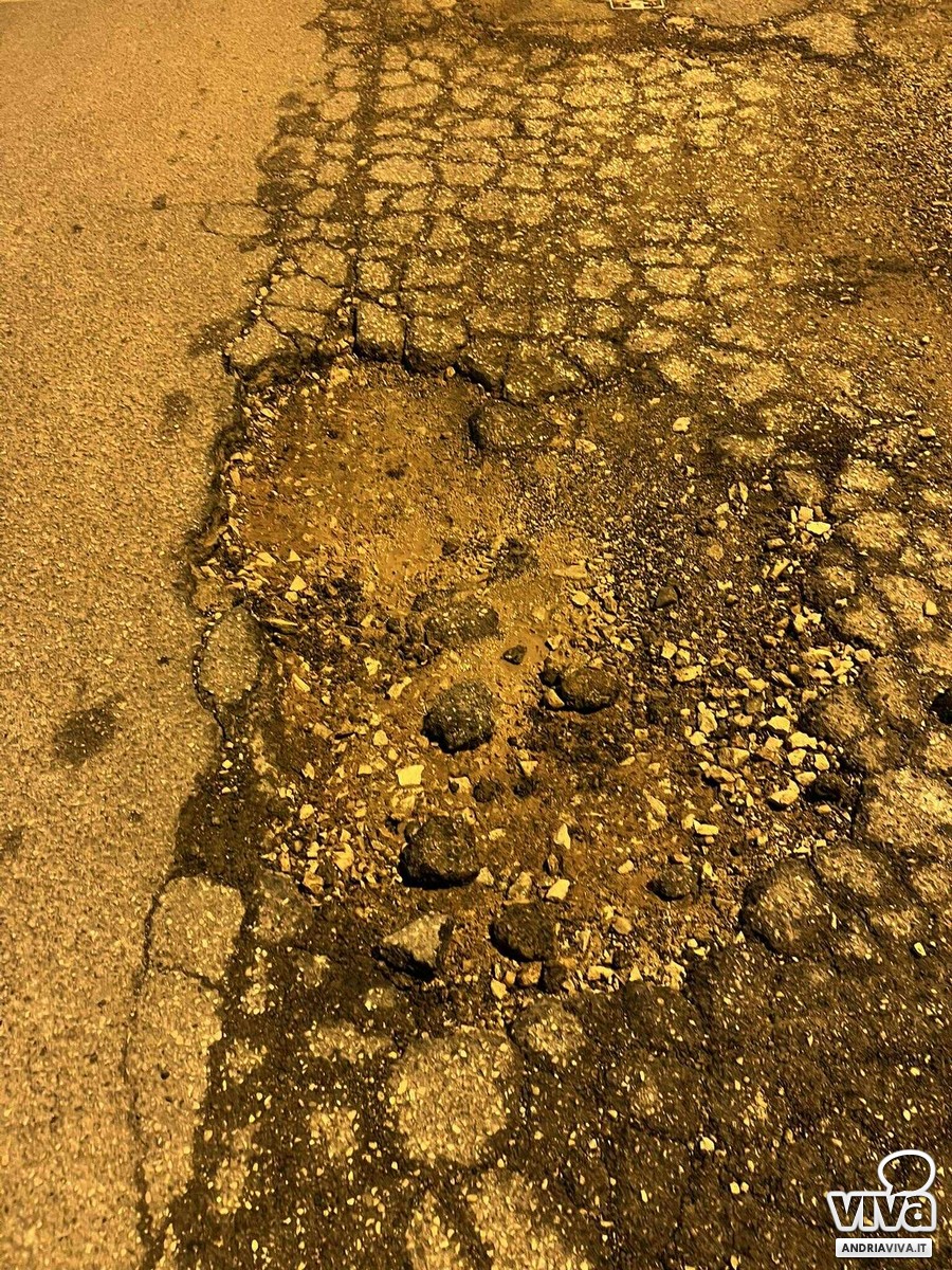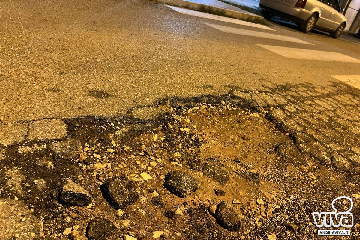 Una buca grande e pericolosa proprio nel bel bel mezzo della carreggiata.