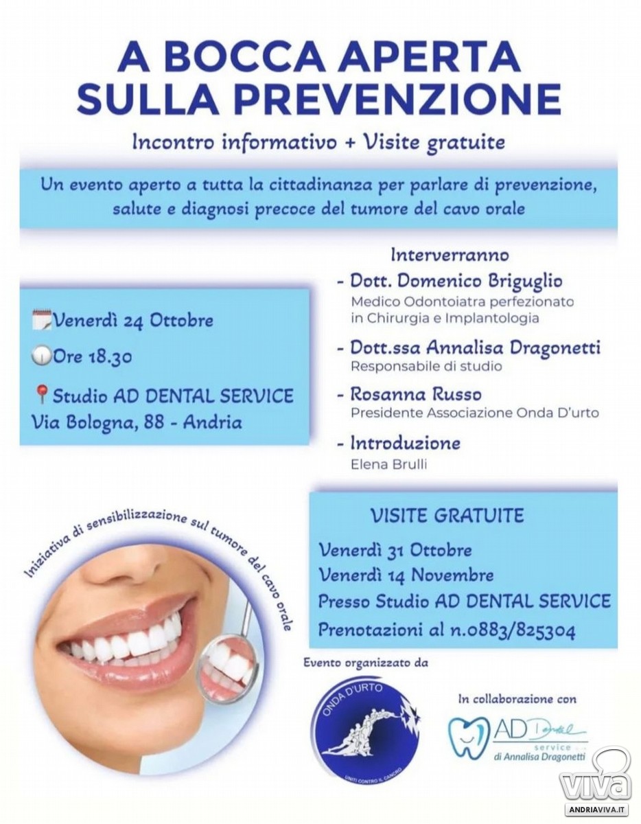 La prevenzione parte da un sorriso. Venerdì 24 ottobre alle ore 18:30, presso lo Studio AD Dental Service di Via Bologna 88 ad Andria, si terrà l'incontro pubblico "A Bocca Aperta sulla Prevenzione", un evento di sensibilizzazione e informazione aperto a tutta la cittadinanza, dedicato alla conoscenza e alla diagnosi precoce del tumore del cavo orale. L'iniziativa, organizzata dall'Associazione Onda D'urto in collaborazione con lo Studio AD Dental Service, nasce con l'obiettivo di diffondere una maggiore consapevolezza sull'importanza della prevenzione e dei controlli periodici, strumenti fondamentali per individuare in tempo eventuali lesioni o alterazioni sospette.