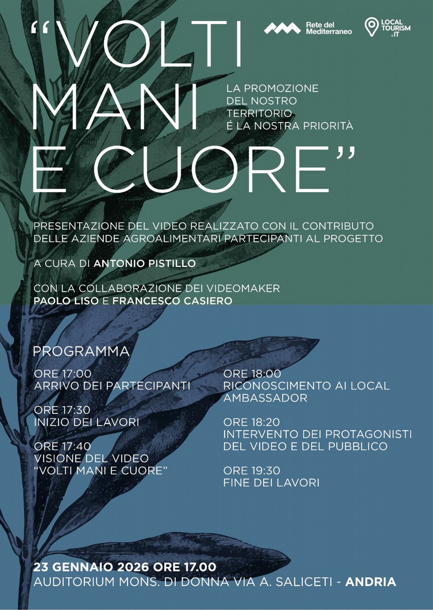 Un progetto editoriale ideato da Antonio Pistillo , curato dalla redazione della Rete del Mediterraneo e da localtourism.it , che restituisce voce, dignità e futuro alle comunità locali attraverso immagini e storie autentiche. Raccontare un territorio partendo dalle persone. Dai loro sguardi, dai gesti quotidiani, dal legame profondo con la propria terra. È questa l'anima di "Volti, Mani e Cuore", il progetto sarà presentato il 23 gennaio 2026 presso l'Auditorium Mons. Di Donna, in via Saliceti ad Andria.