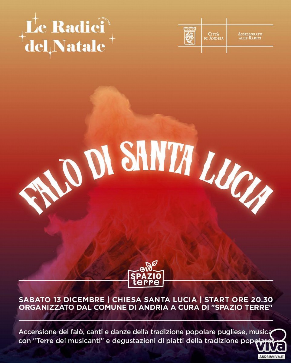 «Con il Falò di Santa Lucia anche Andria recupera e fa rivivere un'antica tradizione popolare – dichiara l'Assessore alle Radici Cesareo Troia – Una iniziativa che abbiamo condiviso con la Rettoria della Chiesa e che ringraziamo per la disponibilità per gli spazi concessi. Il Fuoco, simbolo di purificazione, indica la rinascita e la vittoria del Bene sul male, in onore della Santa Protettrice della vista. Un augurio e un auspicio che facciamo nostro».