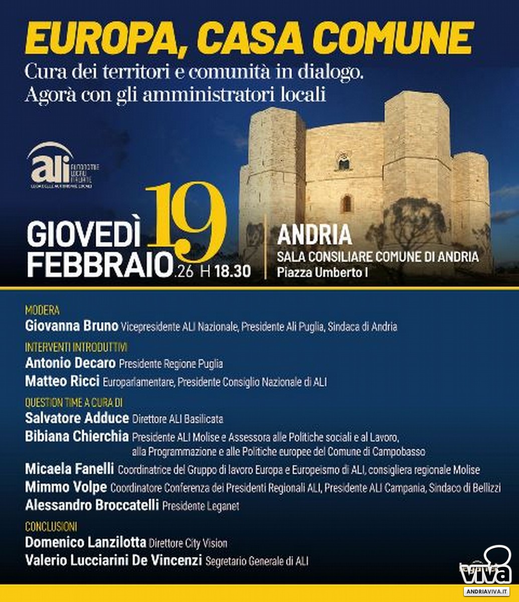 Si terrà giovedì 19 febbraio 2026, alle ore 18.30, presso la Sala Consiliare del Comune di Andria, l'iniziativa "Europa, casa comune. Cura dei territori e comunità in dialogo", promossa da ALI – Autonomie Locali Italiane in collaborazione con Leganet.