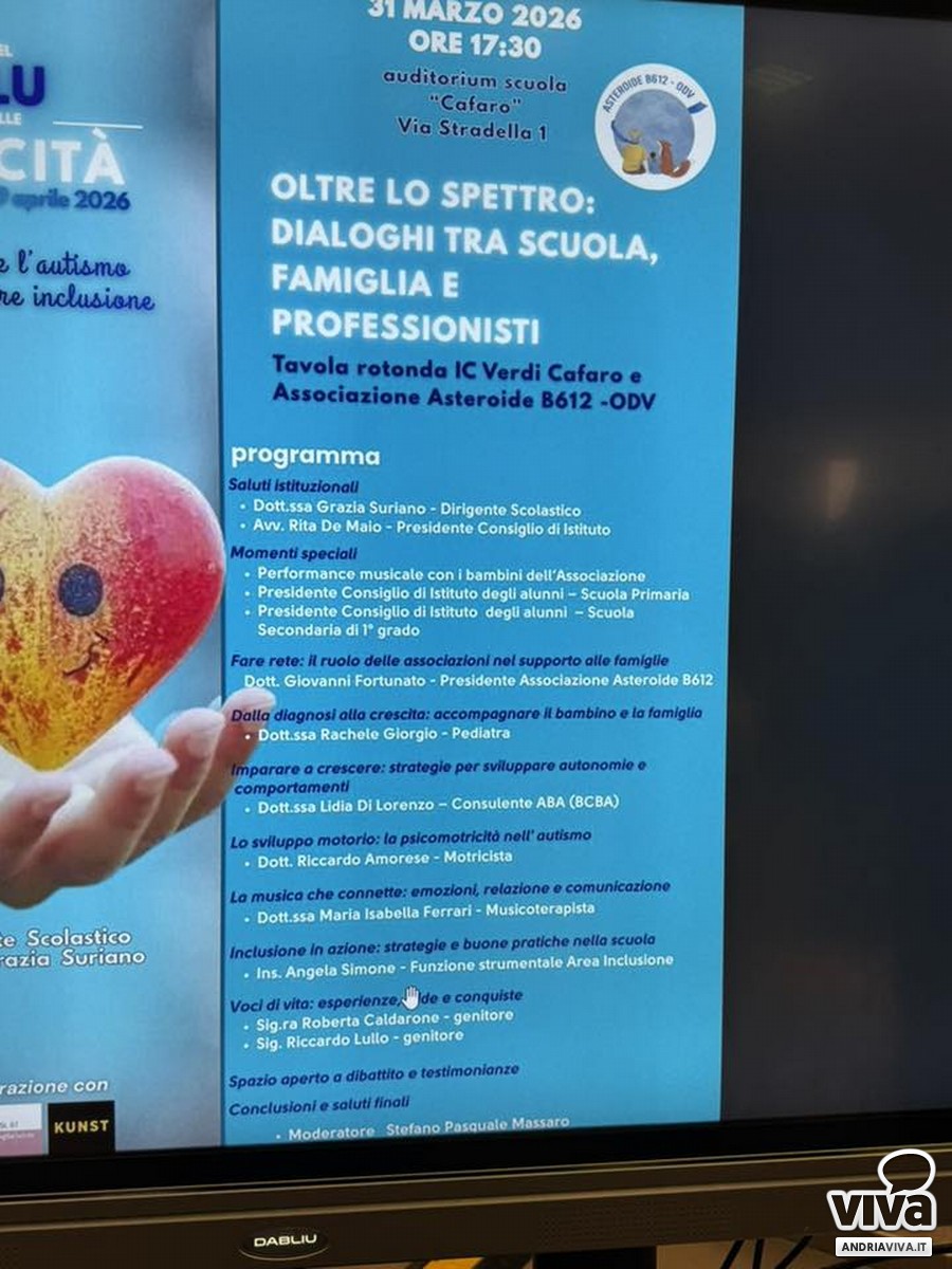 Si è svolta nel pomeriggio del 31 marzo 2026 presso l'auditorium della scuola "Pasquale Cafaro" di Andria, la tavola rotonda dal titolo "Oltre lo spettro: dialoghi tra scuola, famiglia e professionisti": un momento di confronto intenso e partecipato dedicato al tema dell'autismo e dell'inclusione.