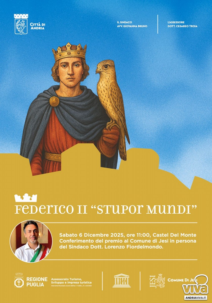 Sarà conferito oggi 6 dicembre alle ore 11 a Castel del Monte il Premio "Federico II Stupor Mundi" edizione 2025 alla Comunità di Jesi, nella persona del Sindaco Lorenzo Fiordelmondo.