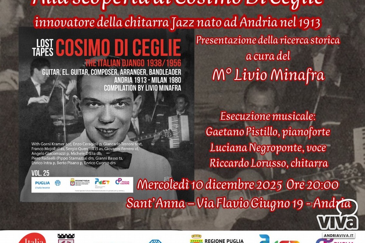 Un evento imperdibile per gli appassionati di musica e storia del jazz: mercoledì 10 dicembre 2025 alle ore 20:00, presso Sant'Anna – Via Flavio Giugno 19, Andria, si terrà la presentazione della ricerca storica dedicata a Cosimo Di Ceglie, straordinario chitarrista, compositore e bandleader, considerato l'"Italian Django" per il suo contributo innovativo alla chitarra jazz tra il 1938 e il 1956.