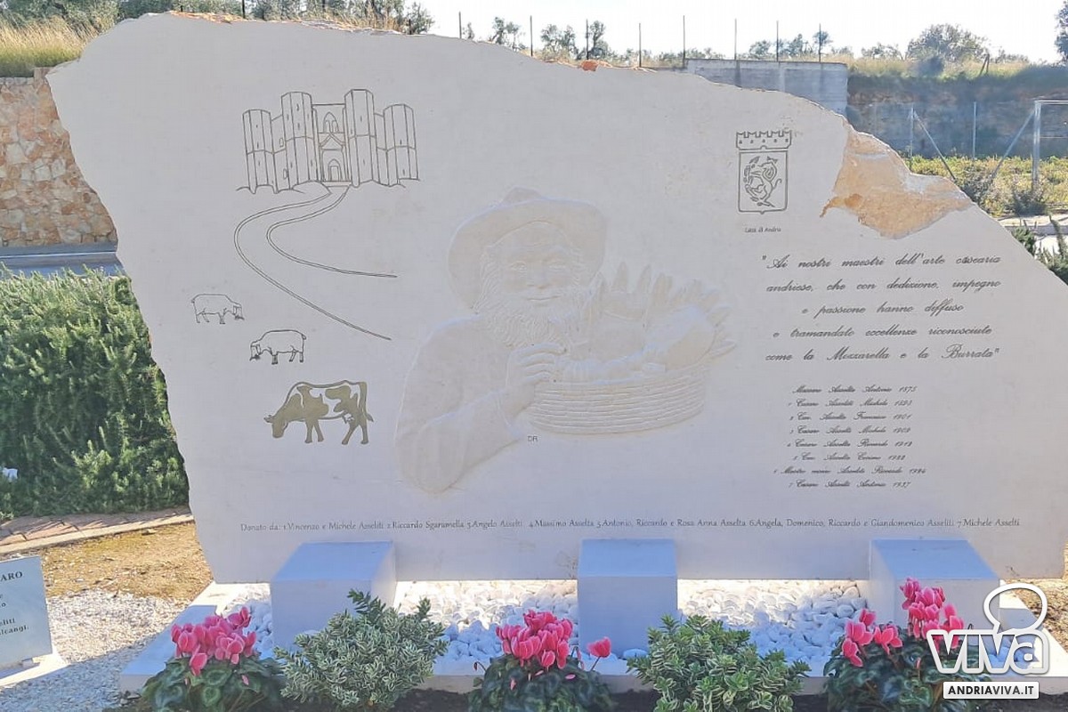 L'opera raffigura un casaro con un paniere di prodotti tipici e reca la dedica: " Ai nostri maestri dell'arte casearia andriese che con impegno e passione hanno diffuso e tramandato eccellenze riconosciute come la mozzarella e la burrata ".