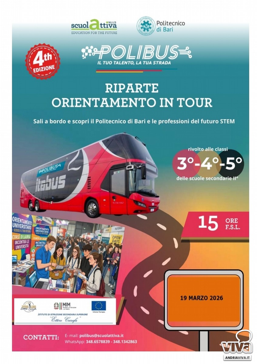 Farà tappa nella mattinata di giovedì 19 marzo, al Polo Liceale "Ettore Carafa" di Andria il PoliBus – Il tuo talento, la tua strada, il tour di orientamento promosso da Politecnico di Bari, ScuolAttiva Onlus e Gruppo Italo per avvicinare i giovani alle discipline STEM.