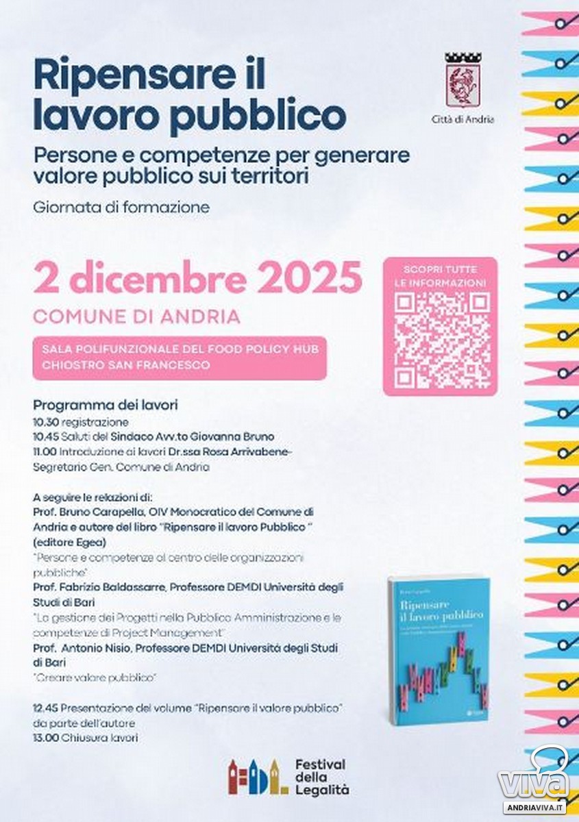 Saluti del Sindaco Giovanna Bruno, introduzione del Segretario Generale del Comune di Andria, dr.ssa Rosa Arrivabene. A seguire, le relazioni del prof. Bruno Carapella, OIV Monocratico del Comune di Andria e autore del libro "Ripensare il lavoro pubblico", sul tema "Persone e competenze al centro della organizzazioni pubbliche"; seguirà il prof. Fabrizio Baldassarre, professore DEMDI Università degli Studi di Bari sul tema "La gestione dei progetti nella Pubblica Amministrazione e le competenze di Project Management"; infine, prof. Antonio Nisio, professore DEMDI Università degli Studi di Bari sul tema "Creare valore pubblico".