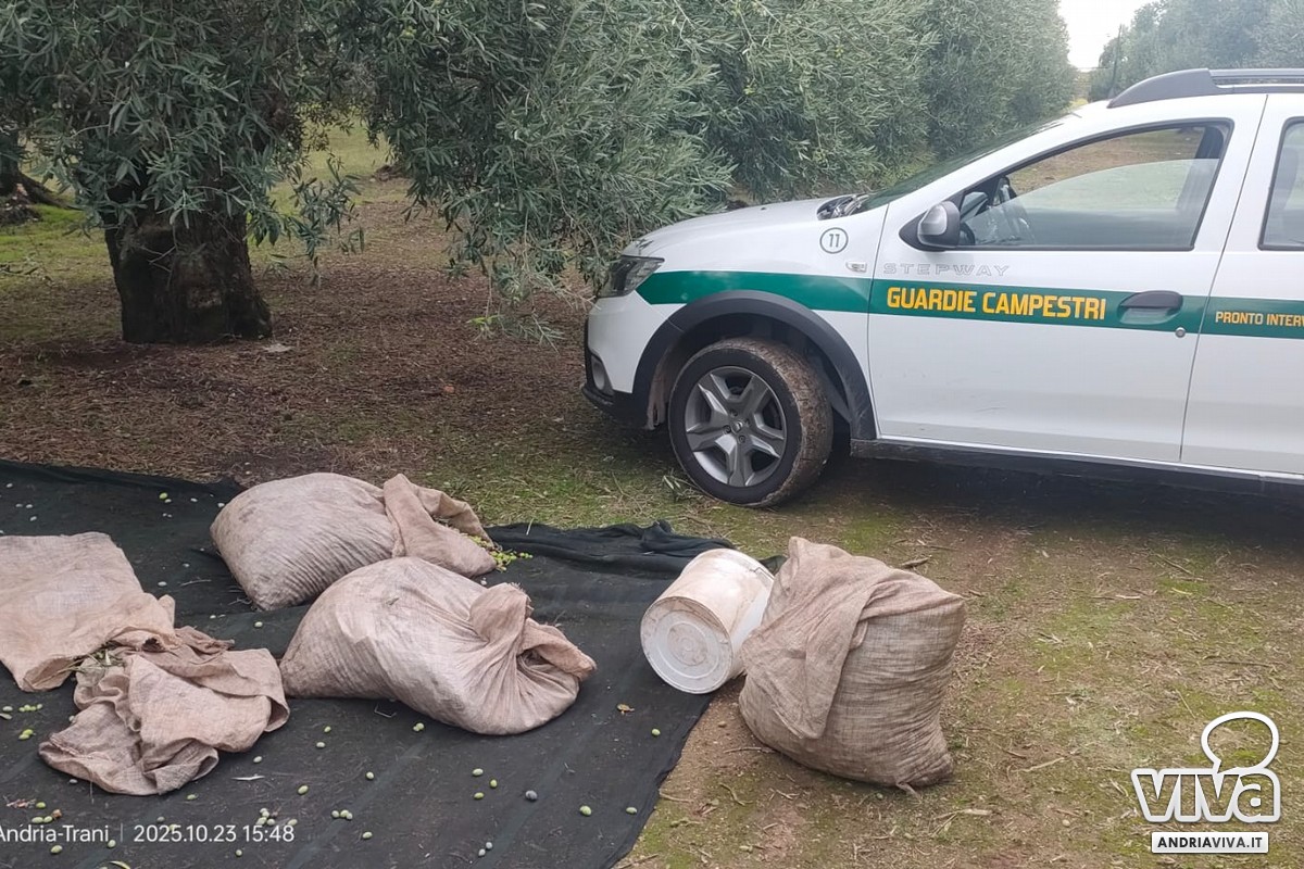 Nel pomeriggio del 23 Ottobre, intorno alle ore 15.30, una pattuglia automontata del Consorzio Guardie Campestri di Andria, in servizio di perlustrazione straordinaria nella zona di agro prossima alla cinta urbana, ha sventato un ingente furto di olive in contrada "Macchie di Rose", dove ignoti malviventi di origine extracomunitaria avevano iniziato la loro azione predatoria, raccogliendo in breve tempo un quantitativo pari a 4 quintali di olive, lasciate poi sul terreno all'interno di alcuni sacchi, a causa della repentina fuga provocata dall'arrivo della pattuglia del Consorzio.