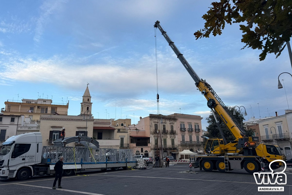 Operai e mezzi al lavoro. Il Natale si avvicina anche ad Andria. In piazza Catuma sono in corso le operazioni per l'allestimento di un maxi albero, ad eseguire l'opera per il gruppo Megamark è come sempre il gruppo de I Monelli nati con "il pallino delle idee". E tra le altre ci sono senz'altro quelle che accompagnano commercianti e cittadini verso le festa più calda dell'anno, il Natale.