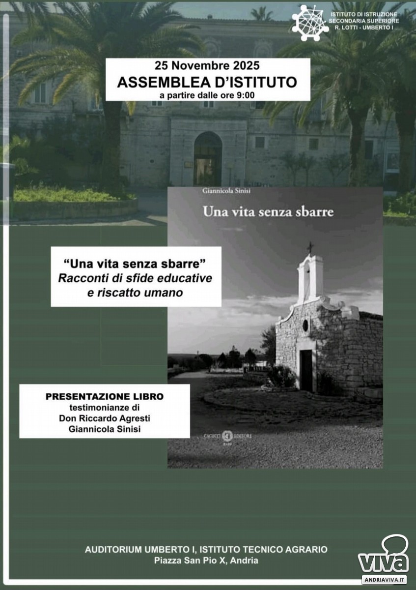 Martedì 25 novembre, a partire dalle ore 9 nell'auditorium della storica sede dell'Istituto Tecnico Agrario di Andria, in piazza Sam Pio X, sarà presentato il libro "Una vita senza sbarre" di Giannicola Sinisi, edito da Cacucci. Racconti di sfide educative e riscatto umano saranno raccontate da Don Riccardo Agresti e dall'ex magistrato della procura barese Giannicola Sinisi.