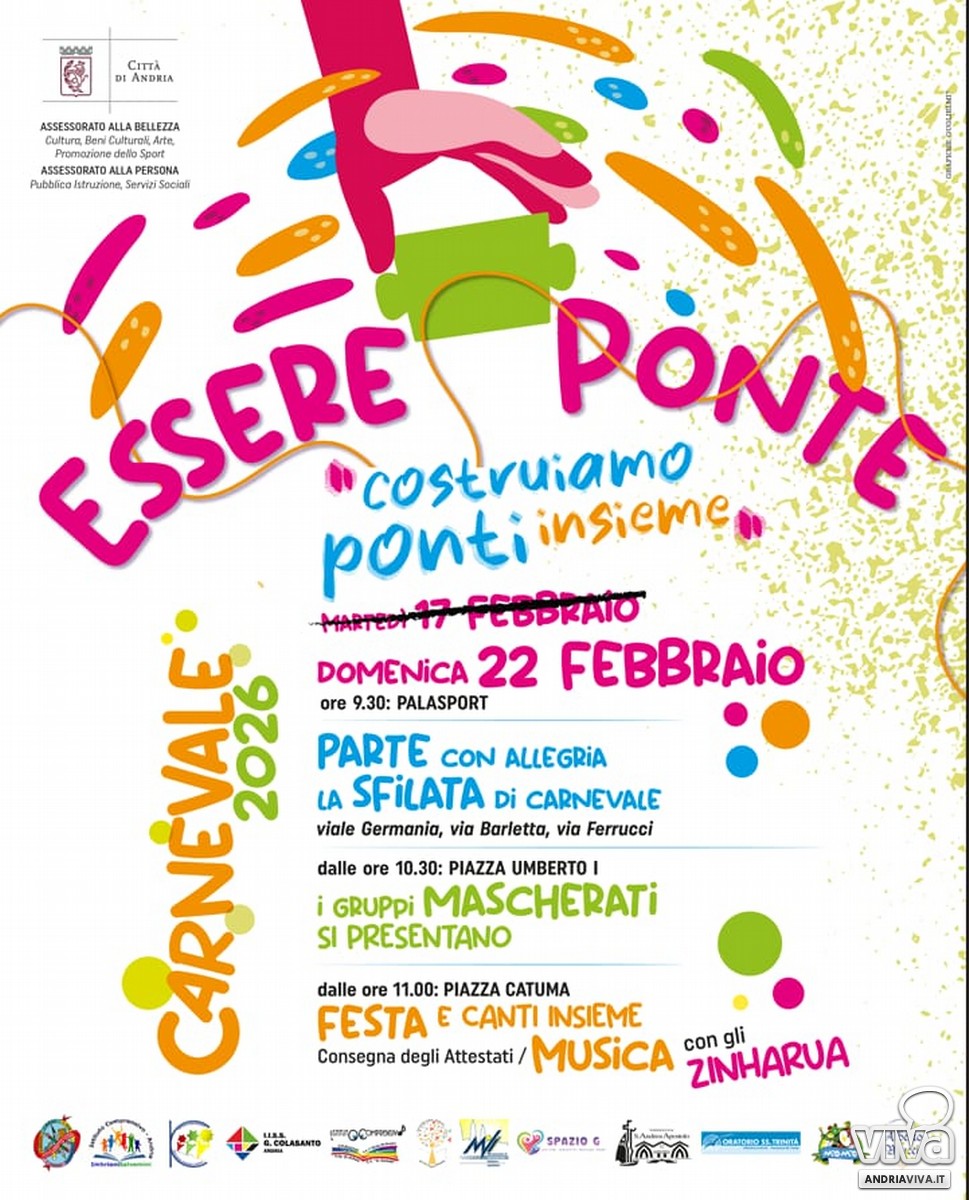 Domenica 22 febbraio la città di Andria vivrà il suo Carnevale. Dopo il rinvio del martedì grasso a causa delle condizioni meteo avverse, la parata in maschera è in programma a partire dalle 9,30 dal Palazzetto dello Sport (ore 9,00 il raduno).