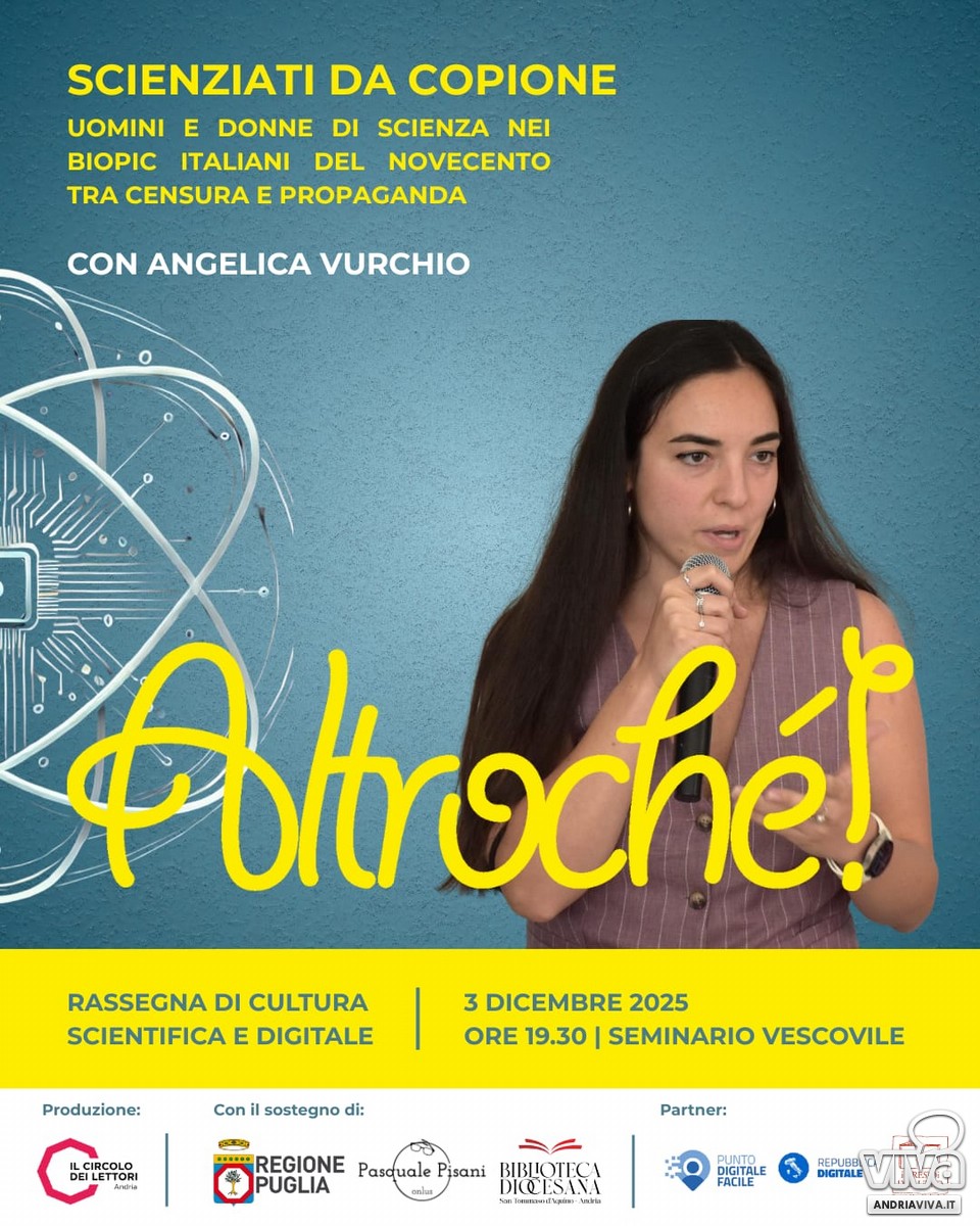 La serata finale, in programma mercoledì 3 dicembre alle ore 19.30 presso il Seminario Vescovile di Andria, sarà affidata ad Angelica Vurchio, autrice del libro Scienziati da copione. Uomini e donne di scienza nei biopic italiani del Novecento tra censura e propaganda (Editrice Bibliografica, 2025).
