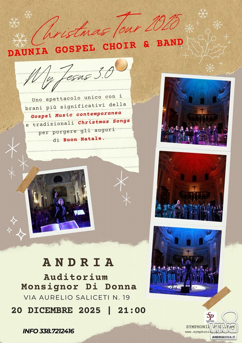 Sabato 20 dicembre, alle ore 21, presso l'auditorium "Monsignor Di Donna", in via Aurelio Saliceti n 19, ad Andria esibizione del Daunia Gospel choir, nel Christmas tour 2025.