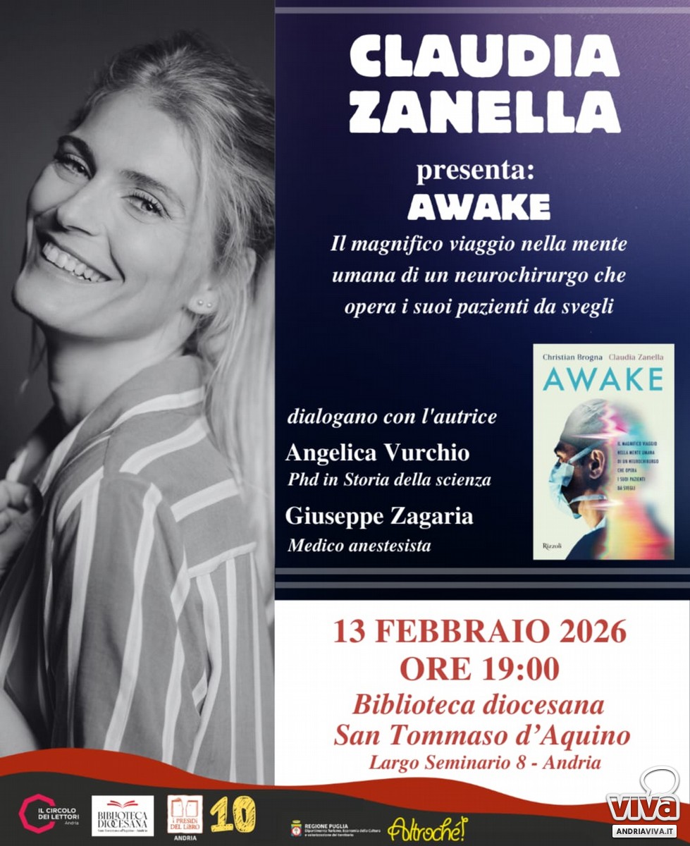 La Biblioteca Diocesana "San Tommaso d'Aquino" di Andria ospiterà venerdì 13 febbraio 2026 alle ore 19:00 la presentazione del libro Awake. Il magnifico viaggio nella mente umana di un neurochirurgo che opera i suoi pazienti da svegli (Rizzoli), scritto dal neurochirurgo Christian Brogna insieme all'attrice e autrice Claudia Zanella, che sarà presente all'incontro.