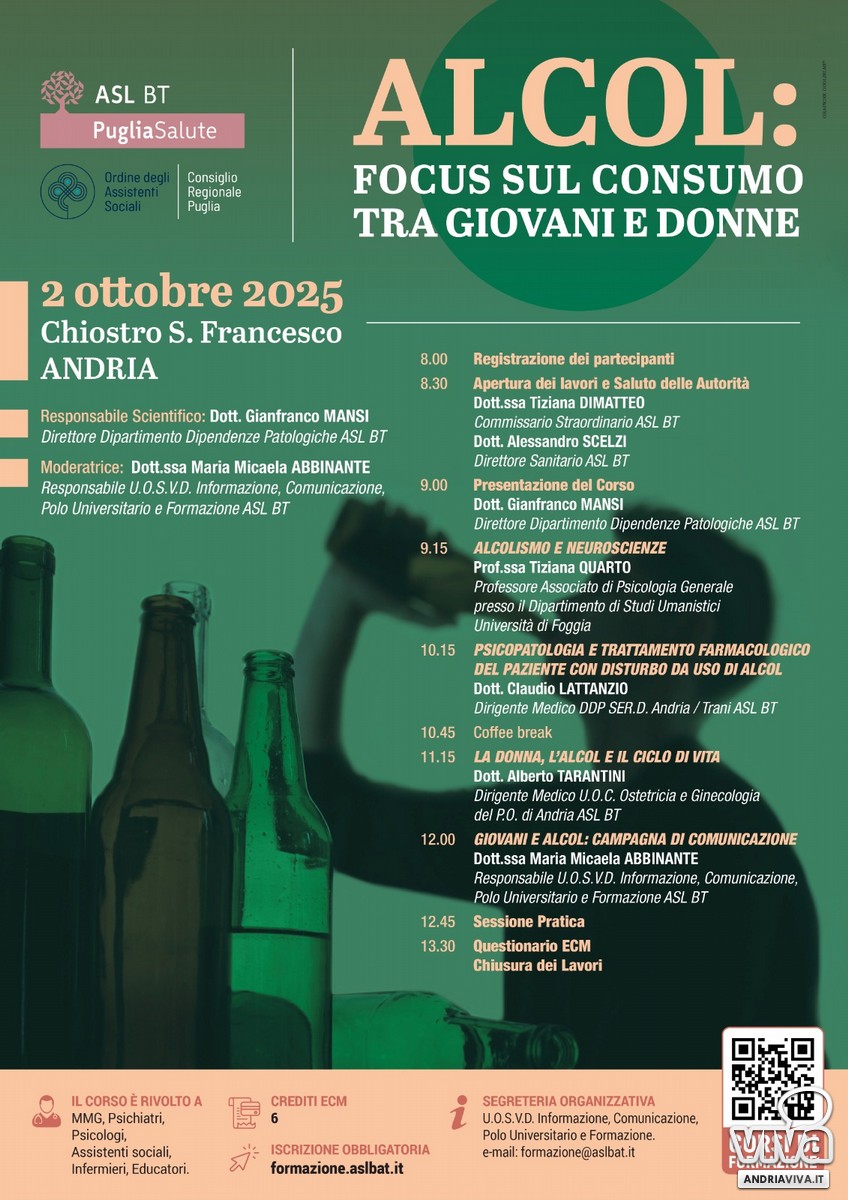 Il Dipartimento Dipendenze Patologiche della Asl Bt, diretto dal dr. Gianfranco Mansi ed in qualità di Responsabile Scientifico, organizza un Convegno ECM nell'ambito delle dipendenze da alcol, evento in programma nella mattinata di giovedì 2 ottobre, alla biblioteca comunale "Giuseppe Ceci"