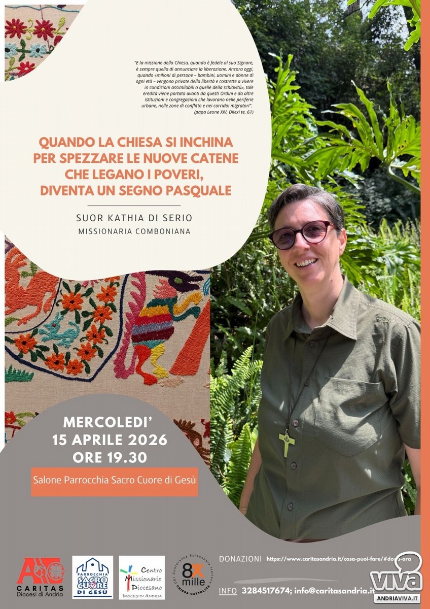 La Caritas diocesana di Andria insieme all'Ufficio Missionario Diocesano e alla Parrocchia Sacro Cuore di Gesù organizzano per mercoledì 15 aprile alle ore 19.30 un incontro con Suor Kathia Di Serio, missionaria comboniana e nostra concittadina, presso il Salone parrocchiale di Via Ponchielli (Parrocchia Sacro Cuore).