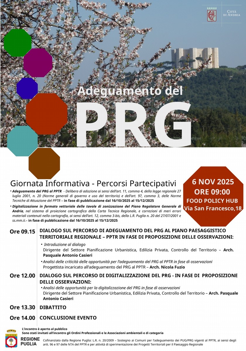 - Digitalizzazione in formato vettoriale delle tavole di zonizzazione del Piano Regolatore Generale di Andria, nel sistema di proiezione cartografica della Carta Tecnica Regionale, e correzioni di meri errori materiali contenuti nella cartografia, ai sensi dell'art. 12, comma 3-bis, della L.R. Puglia n. 20 del 27/07/2001 e ss.mm.ii.– in fase di pubblicazione dal 16/10/2025 al 15/12/2025.