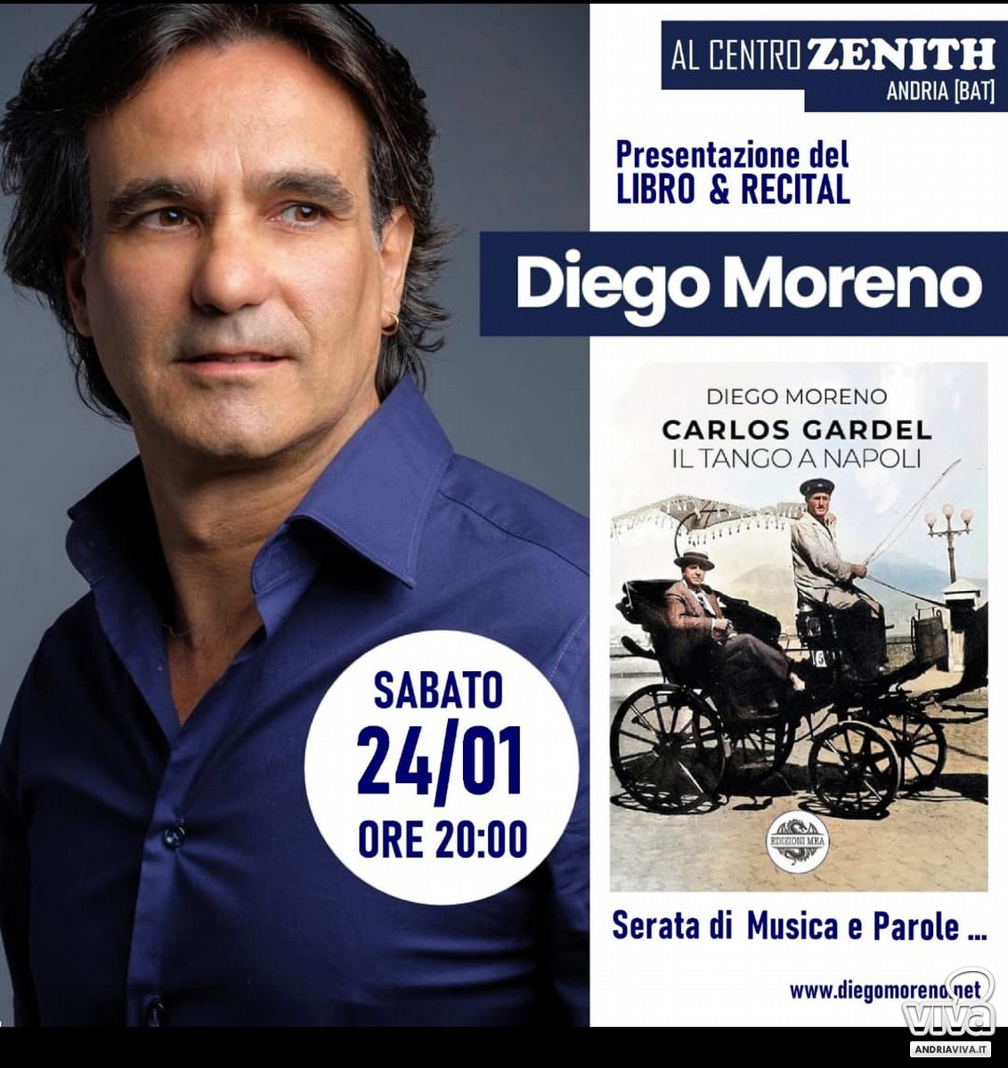 Al Centro Zenith Moreno presenterà la vita avventurosa di Carlos Gardel, leggendario padre del tango canción, raccontandone gli incontri, i successi e le influenze esercitate dalla canzone classica napoletana sulla sua arte. Un viaggio affascinante tra Buenos Aires e Napoli, tra musica, storia ed emozioni, tratto dal suo libro "Carlos Gardel. Il tango a Napoli", pubblicato da Edizioni MEA.