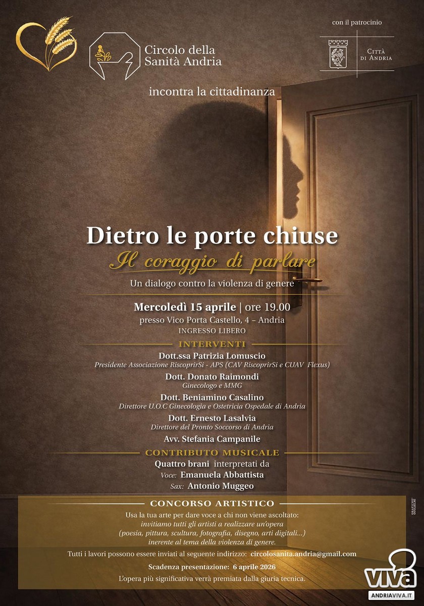 Il Circolo della Sanità di Andria organizza un incontro alla cittadinanza dal titolo «Dietro le porte chiuse — Il coraggio di parlare», un dialogo aperto e multidisciplinare contro la violenza di genere in programma mercoledì 15 aprile alle ore 19.00 presso Vico Porta Castello 4, ad Andria. L'ingresso è libero. L'iniziativa gode del patrocinio della Città di Andria.