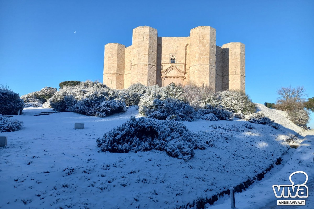 Come da previsioni, primi fiocchi di neve a Castel del Monte ad Andria. Sono caduti nella notte sulla collina della Murgia, alta circa 600 metri. Nel tardo pomeriggio di ieri le temperature sono calare in picchiata regalando nella notte, insieme alla perturbazione, questo scenario fiabesco.
