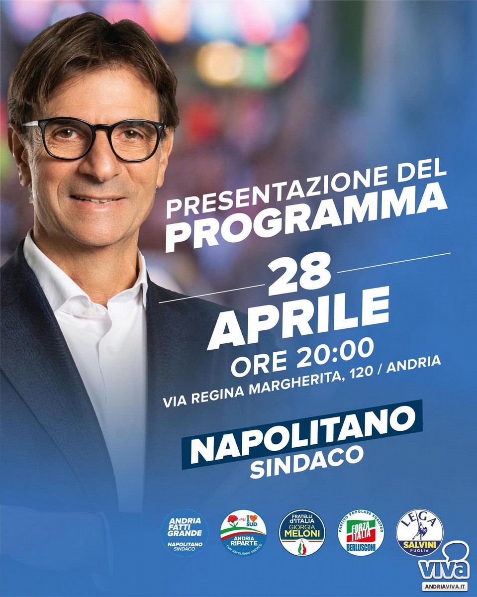 Domani, martedì 28 aprile alle ore 20, il candidato sindaco Sabino Napolitano presenta il programma del centrodestra per Andria.