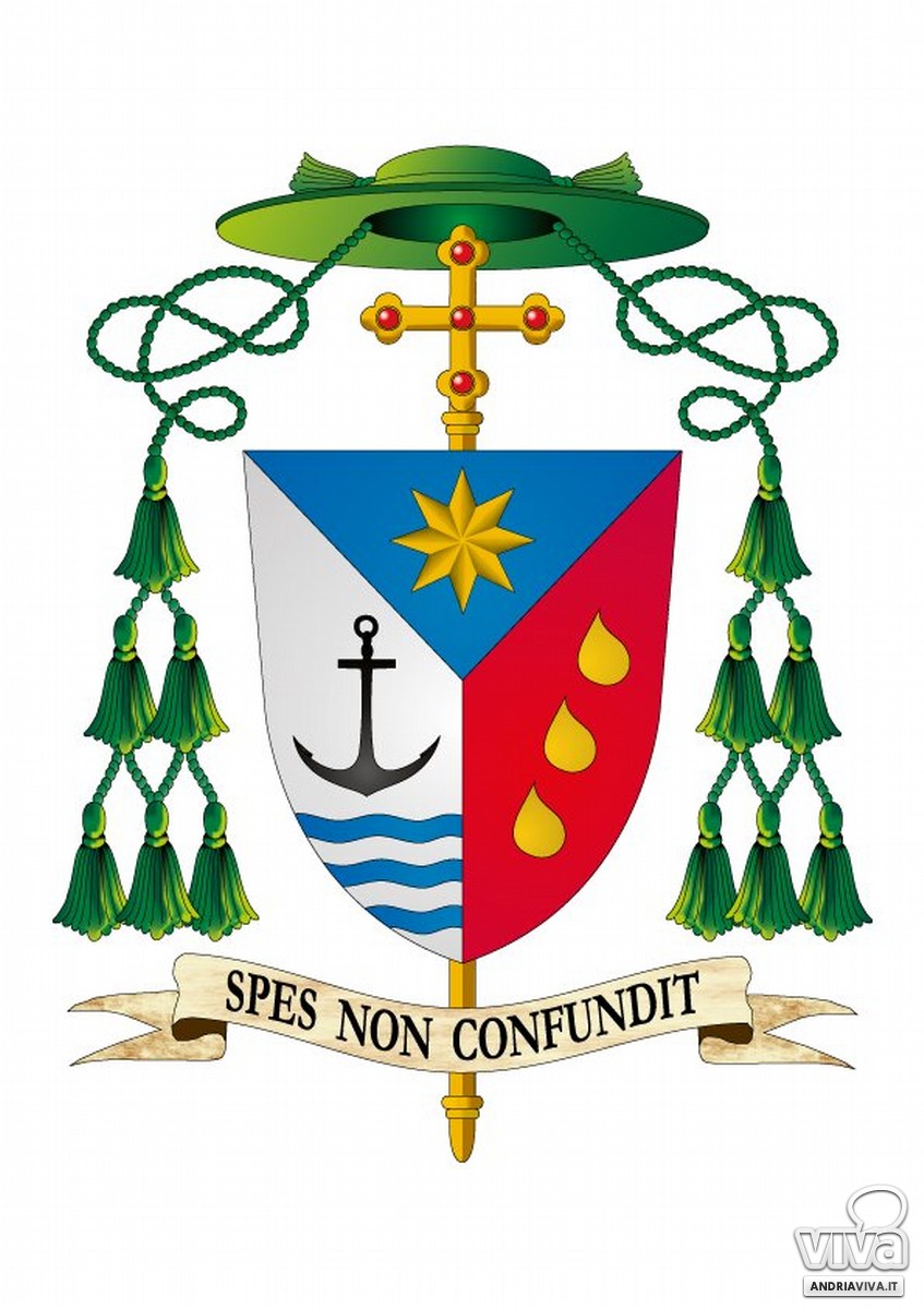 Nella parte destra dello scudo (destra e sinistra sono posizioni invertite in araldica in quanto si riferiscono a chi porta lo scudo, risultando pertanto speculari per chi lo guarda standogli di fronte), appare un'àncora, simbolo di speranza, la Speranza cristiana, come menzionata nella Lettera agli Ebrei: "Perciò Dio, volendo mostrare più chiaramente agli eredi della promessa l'irrevocabilità della sua decisione, intervenne con un giuramento, affinché, grazie a due atti irrevocabili, nei quali è impossibile che Dio mentisca, noi, che abbiamo cercato rifugio in lui, abbiamo un forte incoraggiamento ad afferrarci saldamente alla speranza che ci è proposta. In essa infatti abbiamo come un'àncora sicura e salda per la nostra vita: essa entra fino al di là del velo del santuario, dove Gesù è entrato come precursore per noi" (Eb 6,17-20). Sotto l'àncora troviamo delle onde azzurre che ricordano il mare su cui si affaccia Molfetta, sede del Vescovo. Lo sfondo è d'argento; il colore che simboleggia la trasparenza, quindi la Verità e la Giustizia, doti che accompagnano lo zelo pastorale del Vescovo.