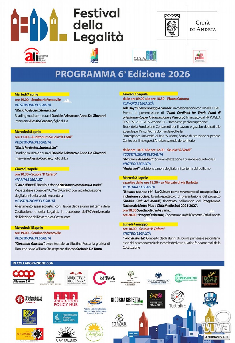 «Il Festival della Legalità non è per noi una semplice rassegna culturale – dichiara la prima Cittadina avv. Giovanna Bruno – ma rappresenta il cuore pulsante di un'azione amministrativa che mette al centro la formazione delle coscienze. il Festival della Legalità entra nel vivo del tessuto cittadino, portando la riflessione sulla giustizia e sul diritto direttamente nelle piazze, nelle scuole e nei centri culturali. Questa sesta edizione si focalizza su testimonianze vive e sul coinvolgimento diretto del mondo della scuola e del lavoro. Partiamo dalla storia di Lia Pipitone per ricordare che la legalità non è un concetto astratto, ma prima di tutto una scelta individuale coraggiosa. Invitiamo tutta la cittadinanza a partecipare: ogni evento è un tassello fondamentale per costruire, insieme, una comunità più consapevole, libera e sicura. Andria deve essere "presente" alla chiamata del dovere civico».