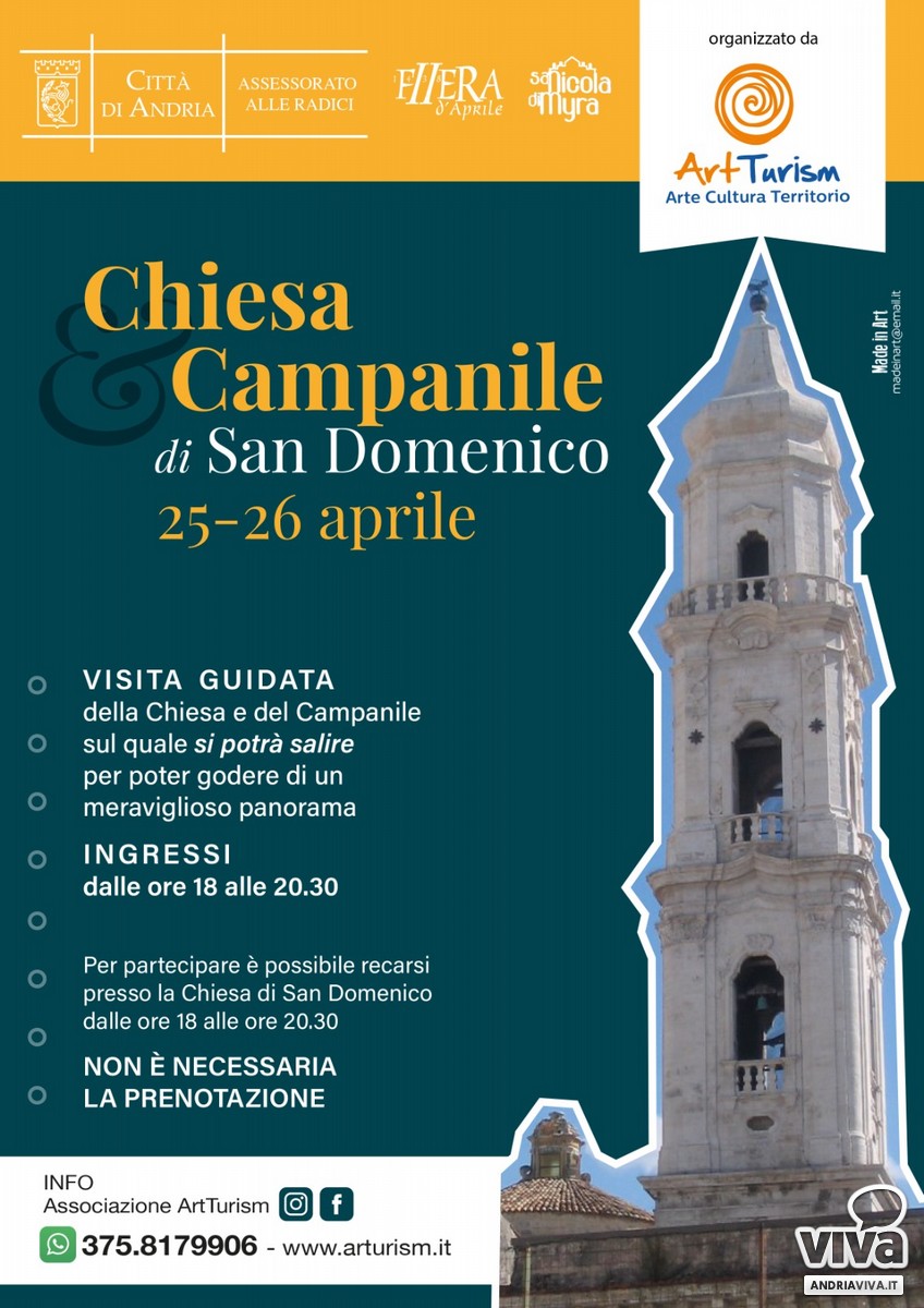 Sabato 25 e domenica 26 aprile, a partire dalle ore 18 e fino alle ore 20:30, sarà possibile visitare la chiesa ed il campanile di San Domenico, a cura dell'associazione ArtTurism. I partecipanti, accompagnati dalle guide turistiche, potranno visitare gli interni della chiesa e salire sul campanile da cui ammirare un affascinante panorama che si spinge oltre il centro abitato, lasciando intravedere anche il sito Unesco Castel del Monte.