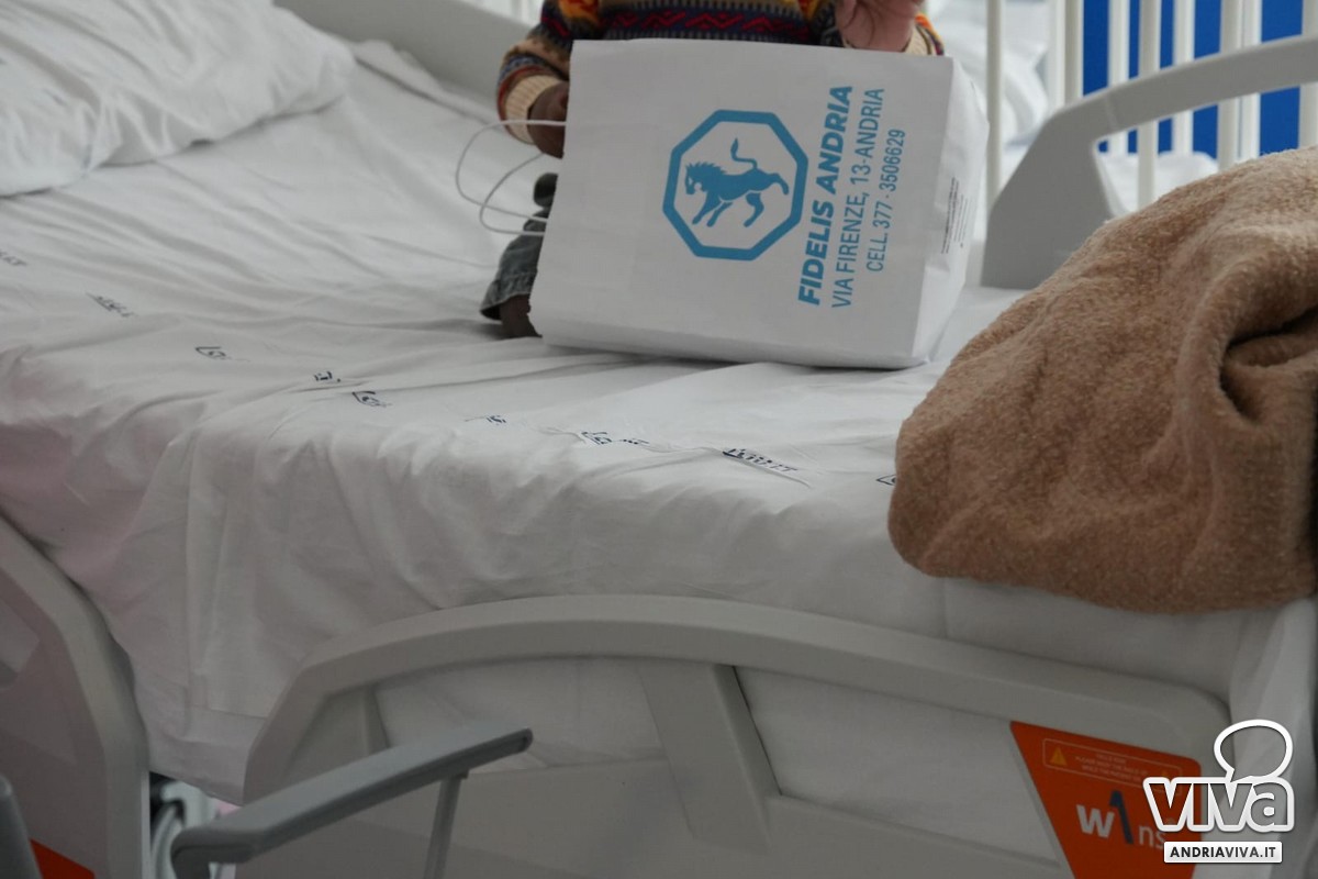 loro carezze, gioia e felicità. L'iniziativa è stata organizzata in occasione delle festività natalizie dall'Amministrazione comunale, con il contributo e il sostegno della tifoseria andriese Combriccola Fidelis, Drunk Group e dello Store ufficiale Fidelis Andria, che hanno offerto rispettivamente le calze della Befana e alcuni gadget targati Fidelis, consegnati personalmente dai giocatori ai piccoli pazienti.