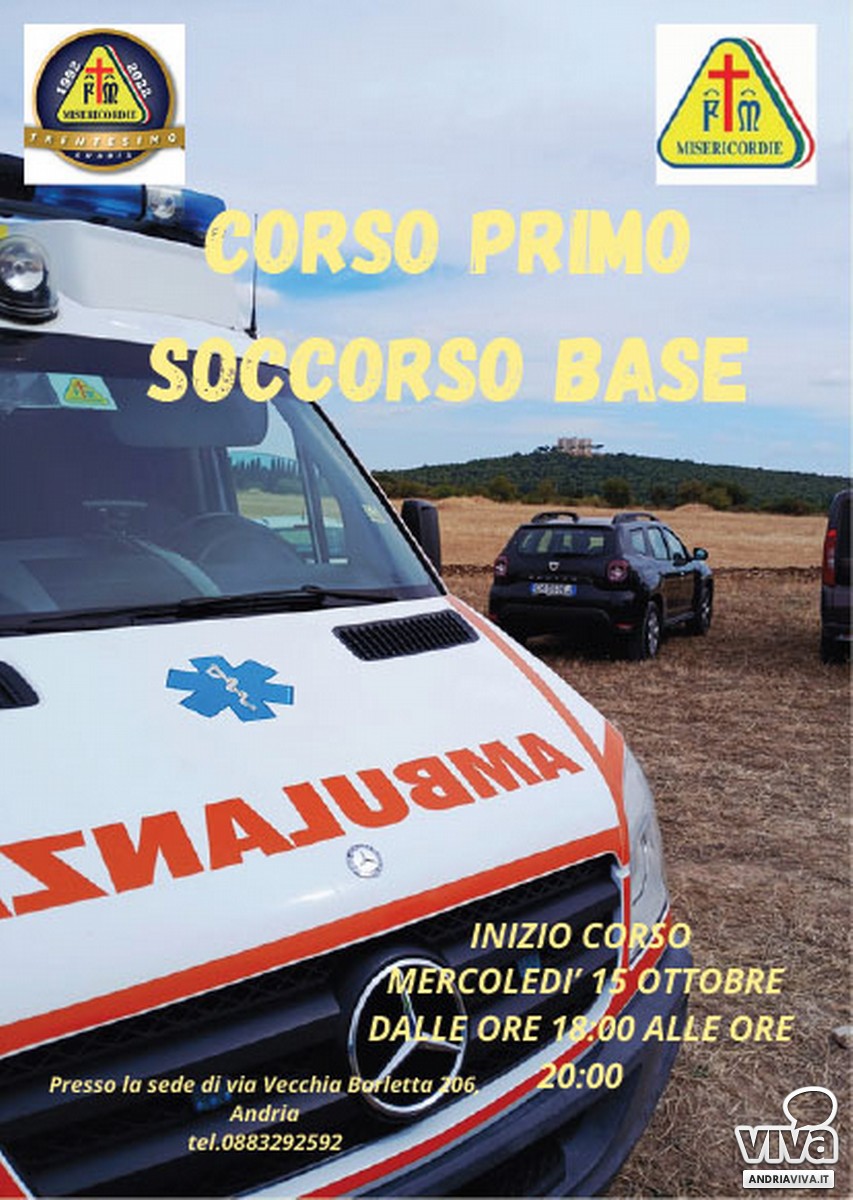 - Corso primo soccorso base, al via mercoledì 15 ottobre dalle 18 alle 20 con 11 lezioni e tirocinio all'interno dei nostri servizi quotidiani.