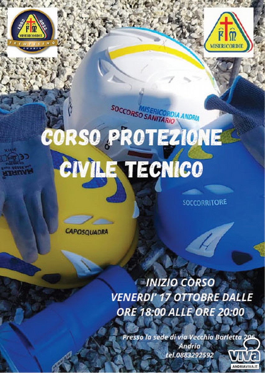 - Corso Protezione Civile Tecnico, al via venerdì 17 ottobre dalle 18 alle 20 con 11 lezioni compresa una esercitazione pratica con mezzi e presidi.