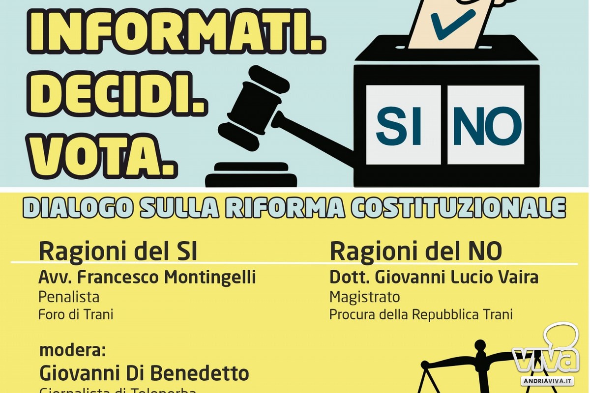 Delle ragioni a sostegno del "sì" e di quelle a sostegno del "no" si parlerà in un incontro informativo che si terrà il prossimo 20 marzo presso il salone "Don Bosco" all'interno dell'oratorio Salesiano ad Andria, in corso Cavour. Per il "sì" al referendum, e quindi alla riforma, si esprimerà l'avvocato penalista del Foro di Trani, Francesco Montingelli, sul fronte opposto, ovvero a favore del "no" alla riforma, interverrà il magistrato della Procura della Repubblica di Trani, Giovanni Lucio Vaira. Modera il confronto, denominato non a caso "Informati. Decidi. Vota." il giornalista di Telenorba, Giovanni Di Benedetto.