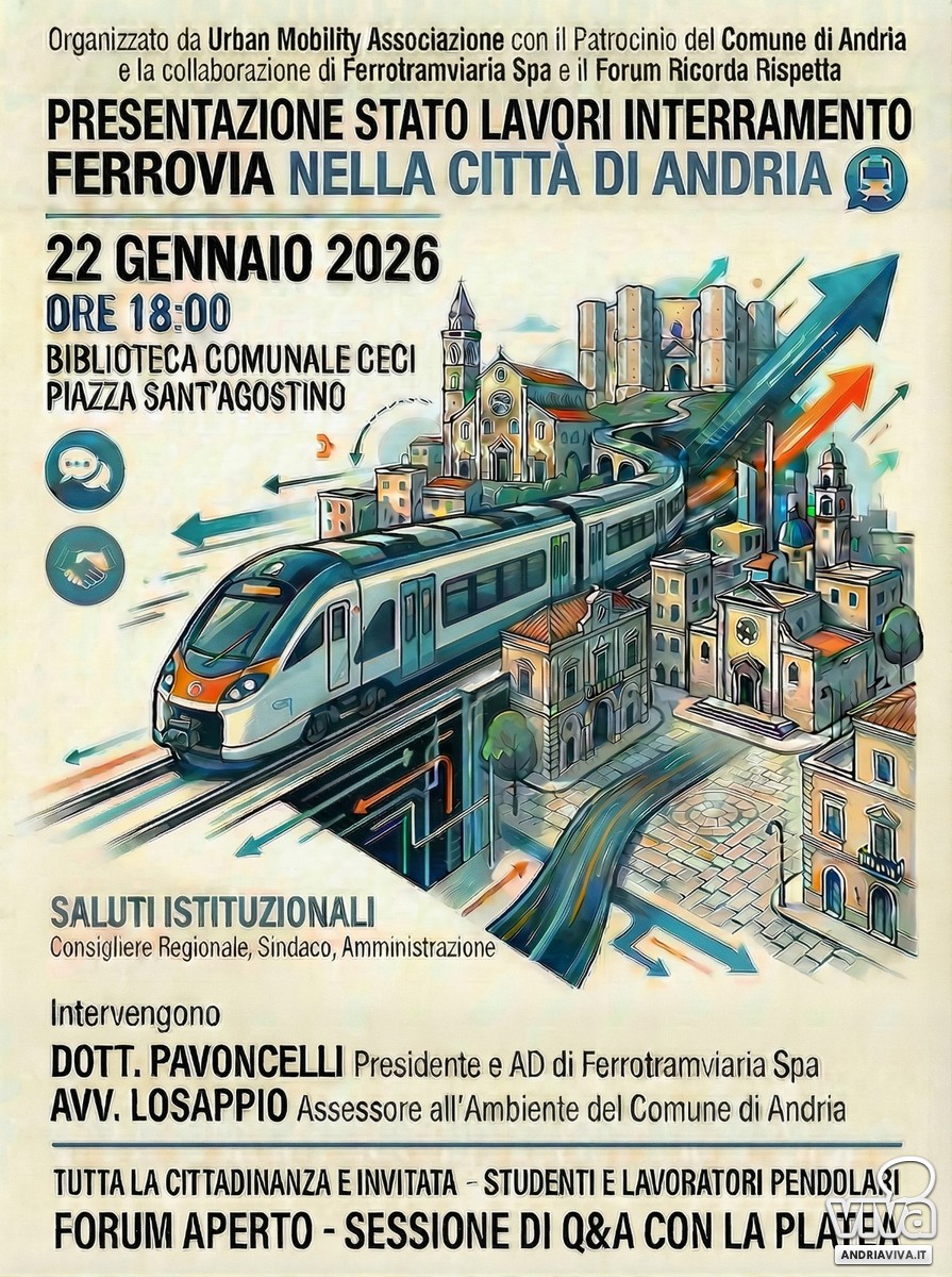 Giovedì 22 gennaio alle ore 18,00 presso la Biblioteca Comunale "Giuseppe Ceci", si terrà la presentazione dello stato dei lavori dell'interramento della Ferrotramviaria nel Centro abitato di Andria.