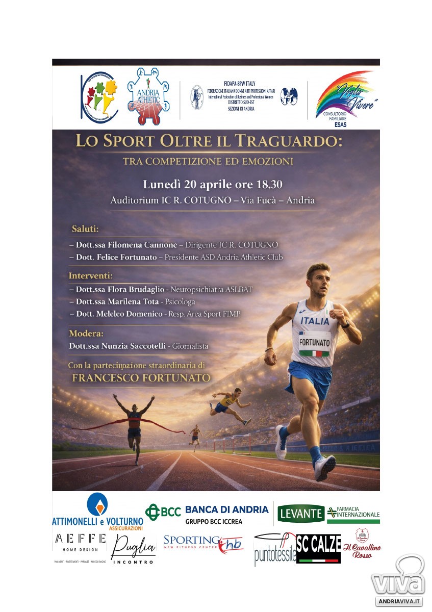 Andria si prepara ad accogliere un importante momento di riflessione dedicato al mondo dello sport e al suo valore umano, educativo ed emotivo. Lunedì 20 aprile alle ore 18:30, presso l'auditorium dell'I.C. "Riccardo Cotugno" (sito in via Fucà), si terrà l'incontro dal titolo "Lo sport oltre il traguardo: tra competizione ed emozioni".