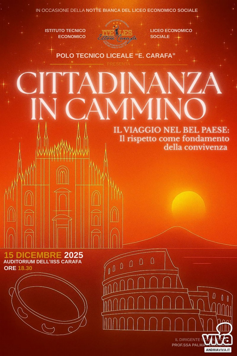 In occasione della Notte Bianca dei Licei, il Polo Tecnico-Liceale Carafa, lunedì 15 dicembre alle ore 18.30, sarà messo in scena il musical "Cittadinanza in cammino… Un viaggio musicale nel Bel Paese".