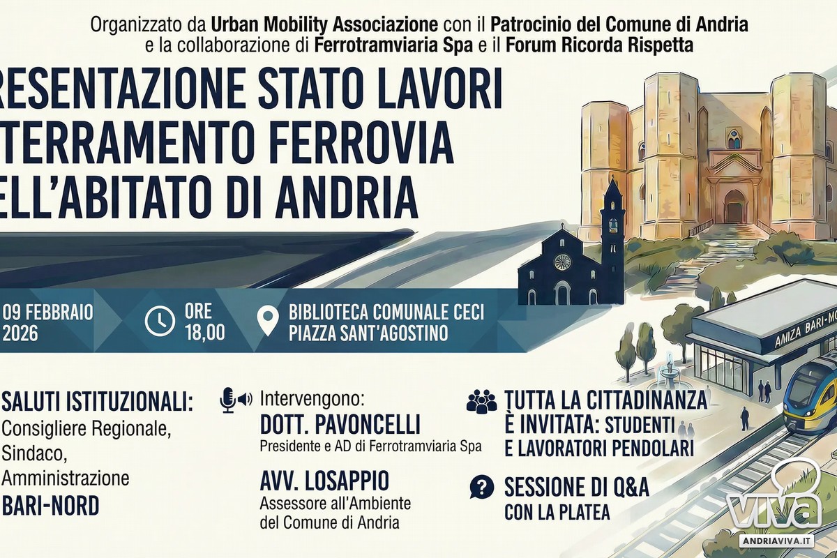 Nuova data per l'incontro con Ferrotramviaria Spa che si terrà lunedì 9 Febbraio alle ore 18,00 presso la Biblioteca comunale "Giuseppe Ceci", la presentazione dello Stato dei lavori dell'interramento della ferrovia nel centro abitato di Andria, durante l'incontro Ferrotramviaria Spa con la presenza del Presidente e AD il dott. Giuseppe Pavoncelli, accompagnato dai tecnici responsabili delle attività operative, presenterà l'avanzamento del progetto, lo stato dei lavori, informando la cittadinanza.