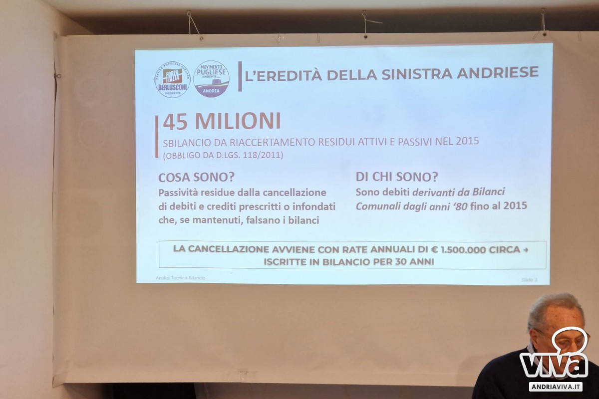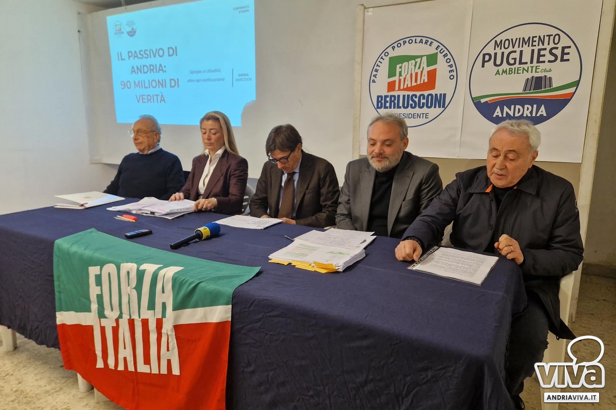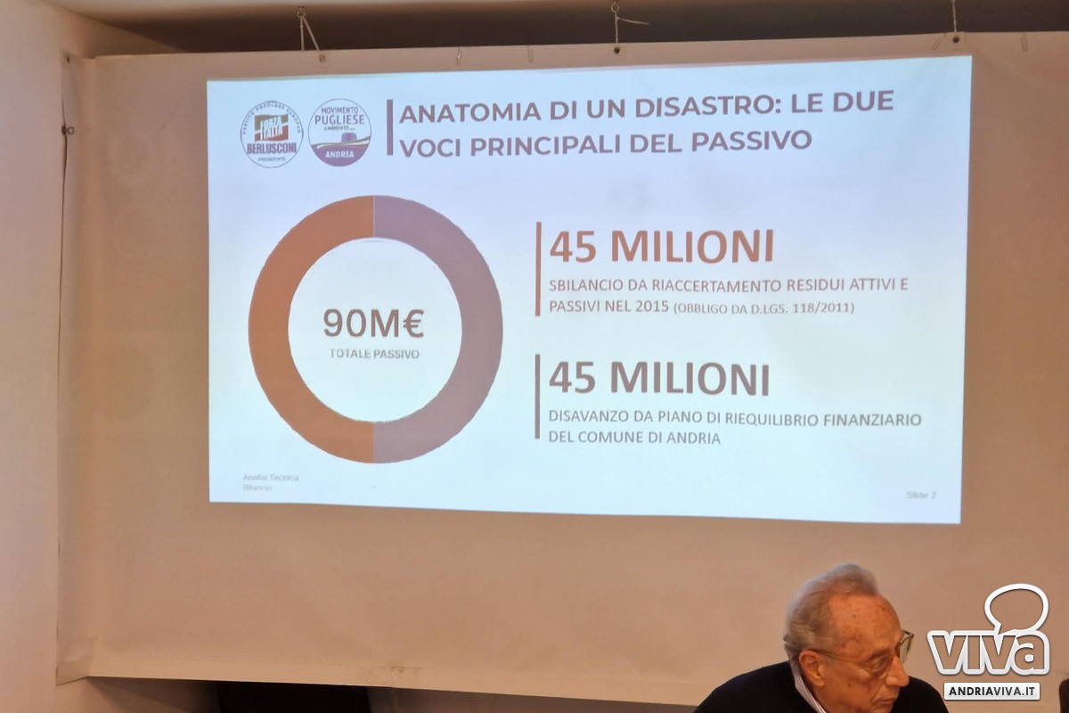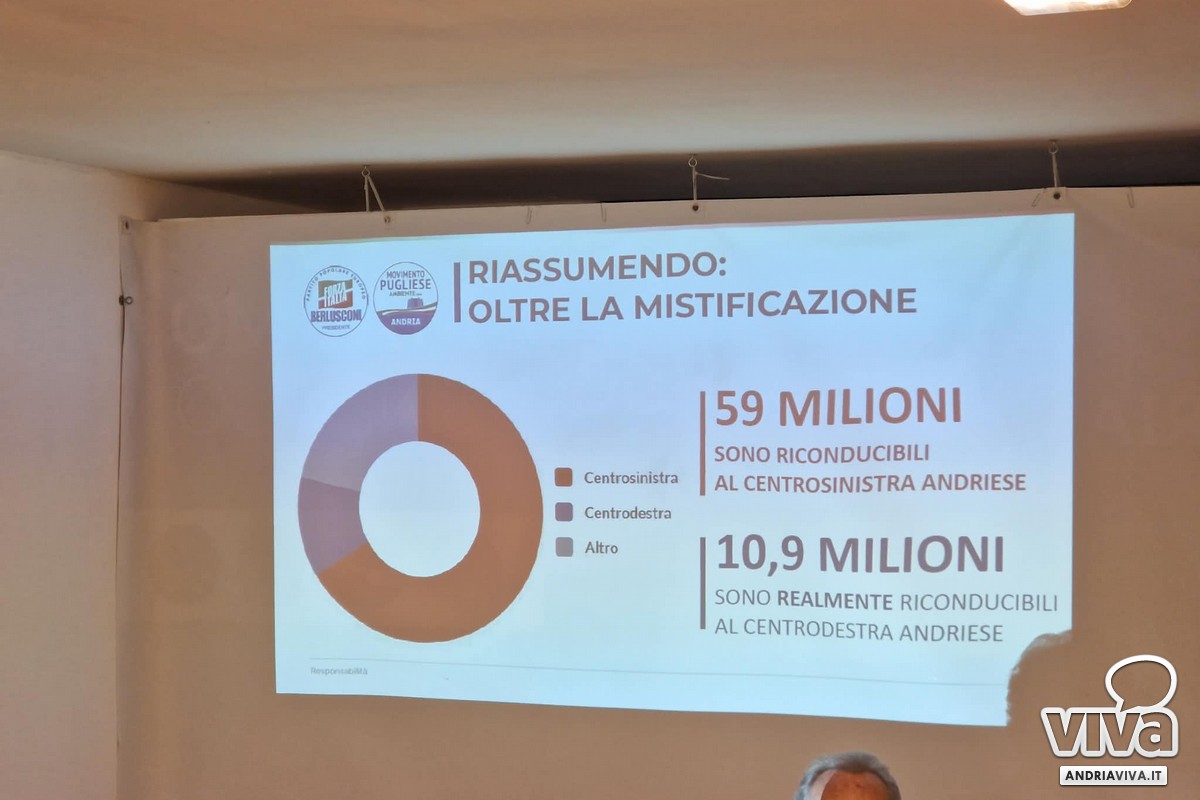 Circa 59 milioni di euro ascrivibili alle amministrazioni di centrosinistra a partire dal 1989, a fronte dei circa 11 milioni di euro attribuibili alle passate gestioni di centrodestra. Ciò che emerge dalle slides mostrate in conferenza è alla base dell'analisi di Forza Italia e Movimento Pugliese, che diventa anche uno degli obiettivi verso il voto di maggio.