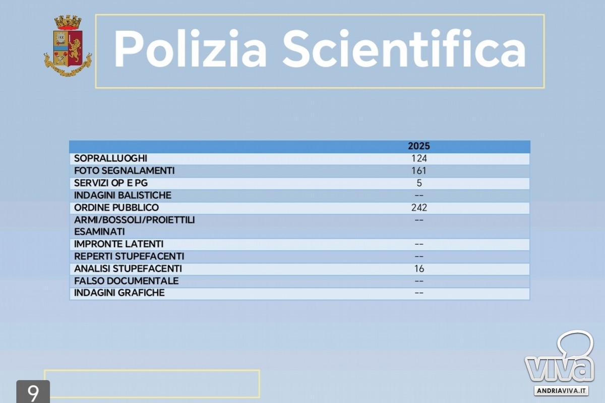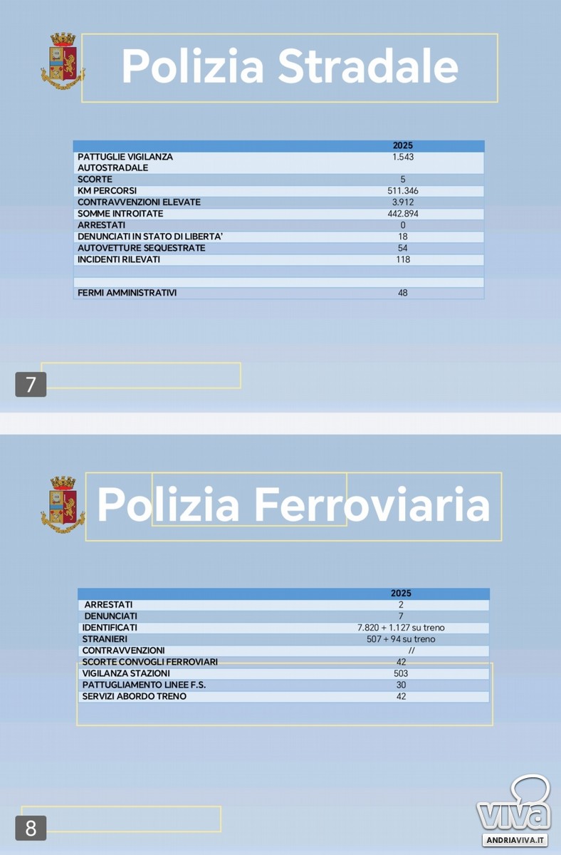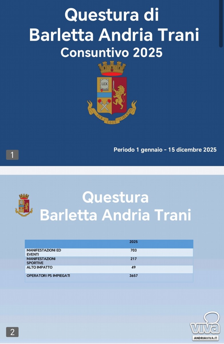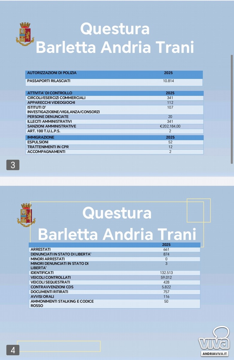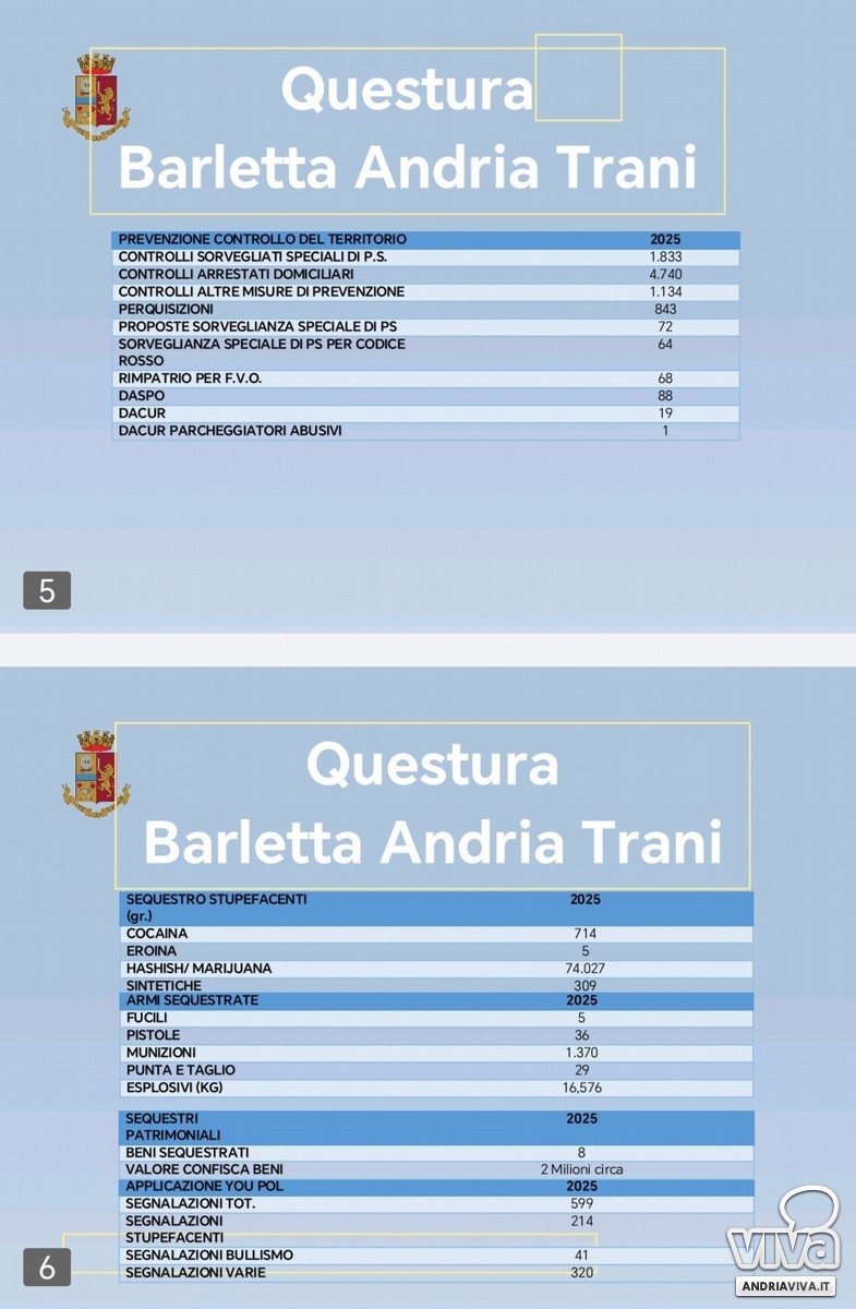 Il Questore della provincia BAT, dott. Alfredo Fabbrocini, ha illustrato i principali risultati conseguiti dai diversi Uffici e Specialità della Polizia di Stato, evidenziando l'impegno costante profuso sul territorio in termini di prevenzione, controllo, contrasto alla criminalità e tutela dell'ordine e della sicurezza pubblica della provincia. Particolare attenzione è stata riservata alle attività di prossimità, al rafforzamento del dialogo con le istituzioni locali e alla gestione delle principali criticità che hanno interessato il contesto sociale e urbano.