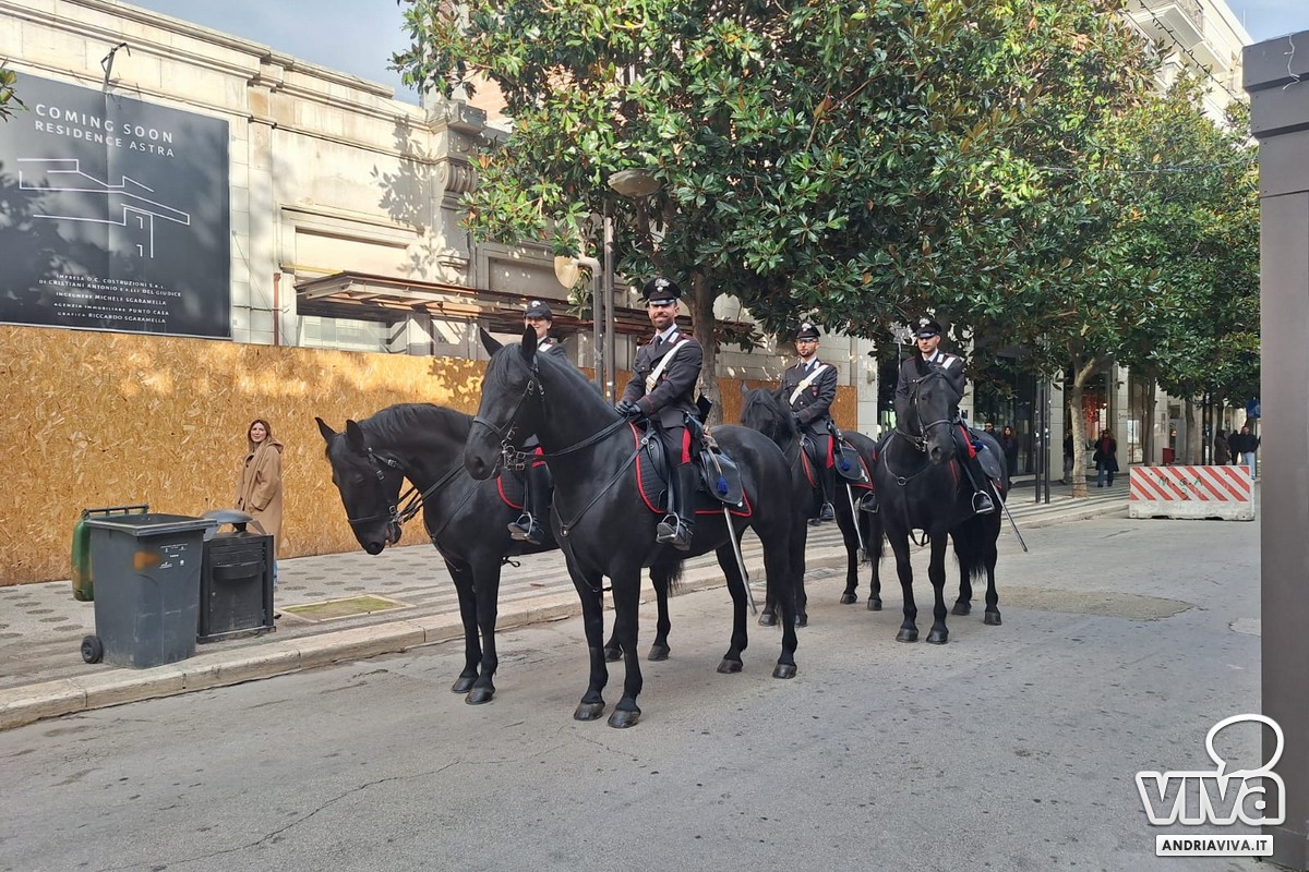 Quattro splendidi esemplari dei cavalli murgesi, appartenenti al 4° Reggimento a cavallo dell'Arma dei Carabinieri, hanno fatto la comparsa questa mattina di buon ora, nella zona pedonale del centro cittadino, chiusa al traffico per la prima domenica ecologica del Natale 2025. Con il periodo natalizio sono finalmente tornate ad Andria le domeniche ecologiche. Dal 7 dicembre al 4 gennaio 2026, per cinque domeniche consecutive, "Natale in città a passo lento" sarà il leit motiv con il quale l'Amministrazione comunale invita residenti e turisti a vivere la città, le sue vie, le sue piazze, i suoi parchi durante il periodo natalizio, quando la città viene animata da eventi e manifestazioni a tema.