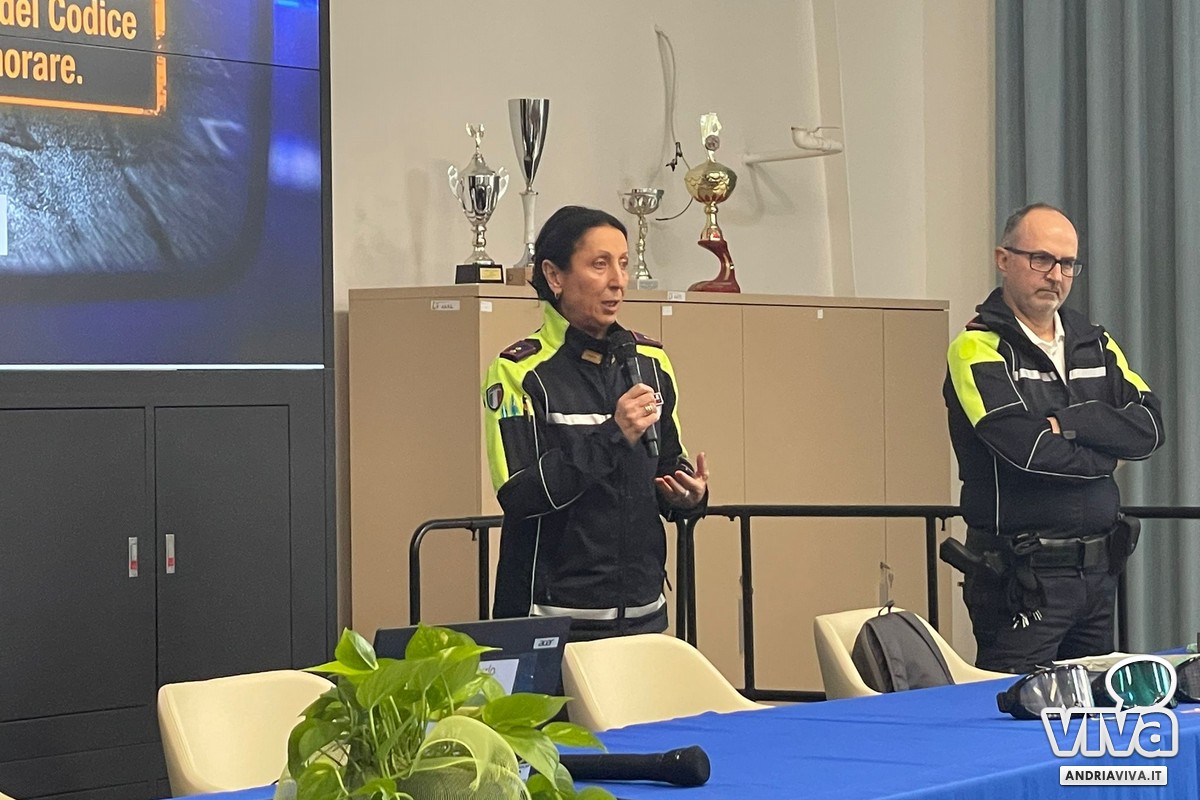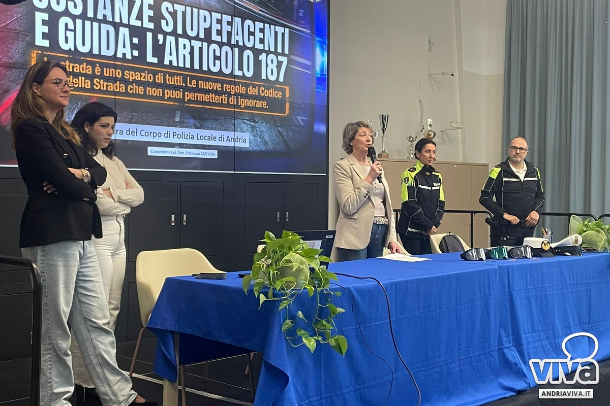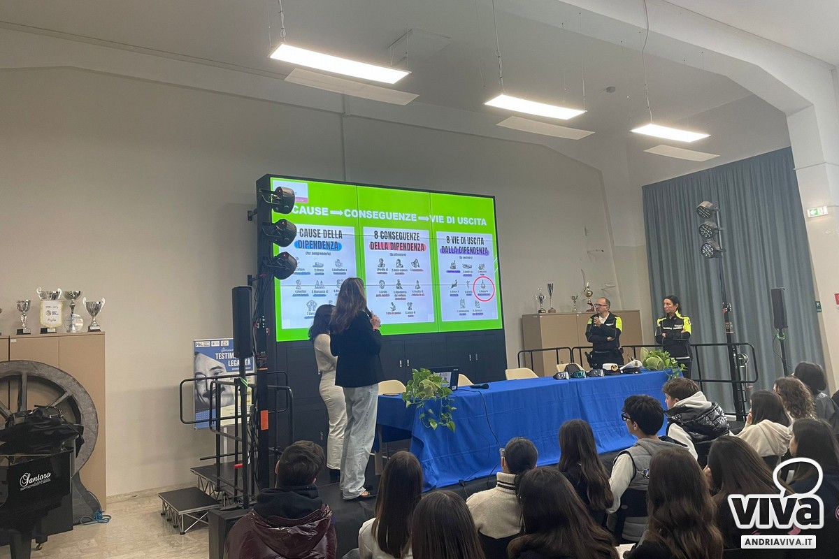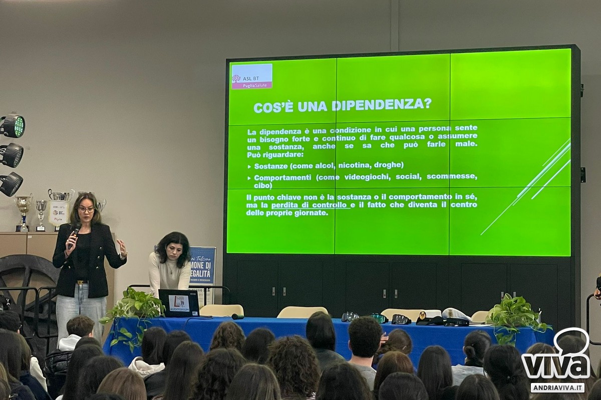 A portare la voce delle istituzioni sono stati l'Ispettore Grazia Forlano e il Vice Sovrintendente Francesco Patruno della Polizia Locale di Andria, che hanno illustrato con competenza le conseguenze amministrative e penali legate all'uso di sostanze psicotrope, con particolare attenzione ai rischi gravissimi che derivano dalla guida in stato di alterazione. Parole chiare e dirette, pensate per parlare alla realtà quotidiana di ragazzi di sedici anni che cominciano ad esplorare il mondo con crescente autonomia e che presto si troveranno a fare i conti in prima persona con le responsabilità della strada: un linguaggio adulto e rispettoso, ma senza sconti. A completare il quadro sono intervenute la dottoressa Agata Massaro, psicologa, e la dottoressa Claudia Carulli, assistente sociale, entrambe del Dipartimento Dipendenze Patologiche della ASL-BT. Le due professioniste hanno guidato gli studenti alla comprensione dei meccanismi biologici e psicologici della dipendenza: come una sostanza può alterare il funzionamento del cervello, modificare le priorità, trasformare una scelta in una trappola. Un approfondimento scientifico reso accessibile, che ha mostrato ai ragazzi quanto sia sottile il confine tra curiosità e rischio.