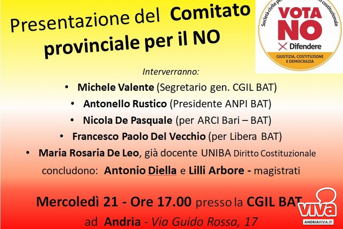 Al via la campagna per il "No" al referendum costituzionale sulla giustizia. Il comitato provinciale si costituisce e spiega le ragioni del dissenso. All'iniziativa, in programma oggi 21 gennaio alle ore 17 presso la sede della Cgil Bat in via Guido Rossa ad Andria saranno presenti i referenti di tutte le realtà che fino a questo momento hanno aderito. Interverranno: Michele Valente, segretario generale Cgil Bat, Antonello Rustico, presidente Anpi Bat, Nicola De Pasquale, Arci Bari-Bat, Maria Rosaria De Leo, già docente di Diritto Costituzionale presso l'Uniba e Francesco Paolo Delvecchio, Libera Bat. Concludono i magistrati Lilli Arbore, presidente della sezione Lavoro del Tribunale di Trani nonché componente della Giunta esecutiva centrale dell'Associazione Nazionale Magistrati e Antonio Diella, presidente esecutivo del comitato per il "No" al referendum sulla giustizia.