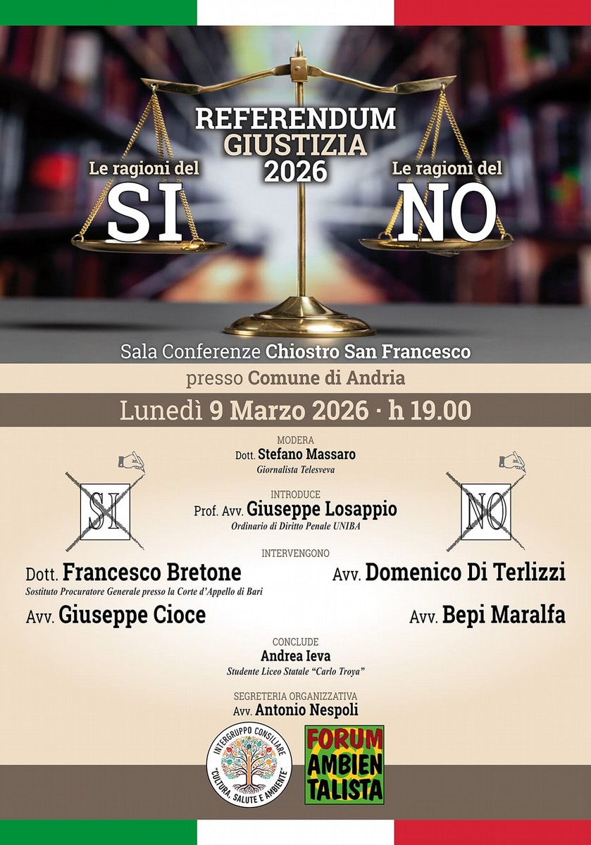 Lunedì 09 marzo alle ore 19.00, presso la Sala Conferenze del Chiostro San Francesco, l'Intergruppo consiliare "Cultura, Salute e Ambiente", unitamente al Forum Ambientalista, organizza un convegno riguardante il Referendum sulla Riforma della Giustizia che avrà il suo traguardo i giorni del 22-23 marzo prossimi, nel corso del quale saranno illustrate da prestigiosi relatori le ragioni del SI e le ragioni del NO.