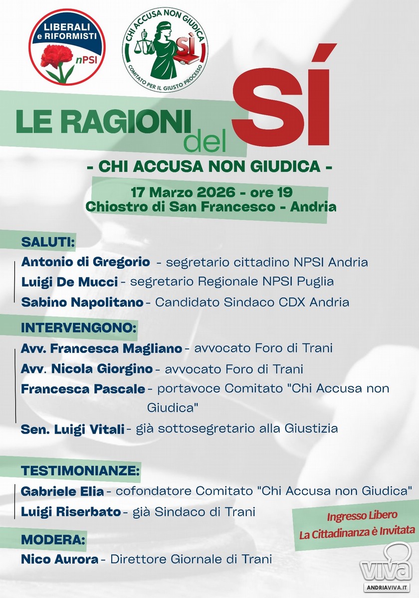 Si terrà martedì 17 Marzo 2026, alle ore 19, presso il Chiostro di San Francesco della Città di Andria, l'incontro dal titolo "Le Ragioni del Sì. Chi Accusa non giudica" promosso dalla segretaria cittadina del Nuovo Partito Socialista Italiano della città federiciana, unitamente al Comitato per il Giusto Processo, in vista del voto referendario del prossimo 22 e 23 Marzo.