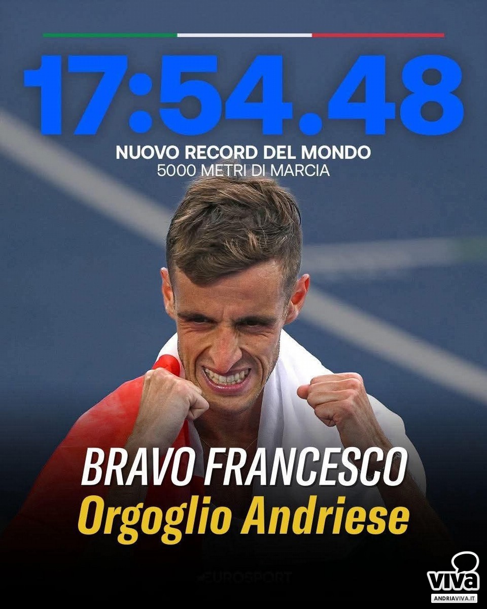 «Un'altra gioia per lo sport andriese. A regalarcela è ancora Francesco Fortunato, il campione della marcia che è salito sul tetto del mondo. Ieri ai Campionati Italiani Indoor di Ancona, il nostro Francesco ha fermato il cronometro su 17:54.48 nei 5mila metri, migliorando di oltre 12 secondi il precedente primato mondiale. Un'altra prova di grande spessore atletico e umano per il nostro atleta, che nonostante l'influenza che lo ha frenato nella preparazione, è riuscito a conquistare il suo 19esimo titolo italiano con annesso record mondiale. Francesco è il simbolo della tenacia, dell'impegno e del sacrificio: valori che sono alla base dello sport. Complimenti a lui, affinché continui ad essere l'esempio per i tanti giovani andriesi che praticano attività sportive in città, e che risultano un valore aggiunto per Andria».