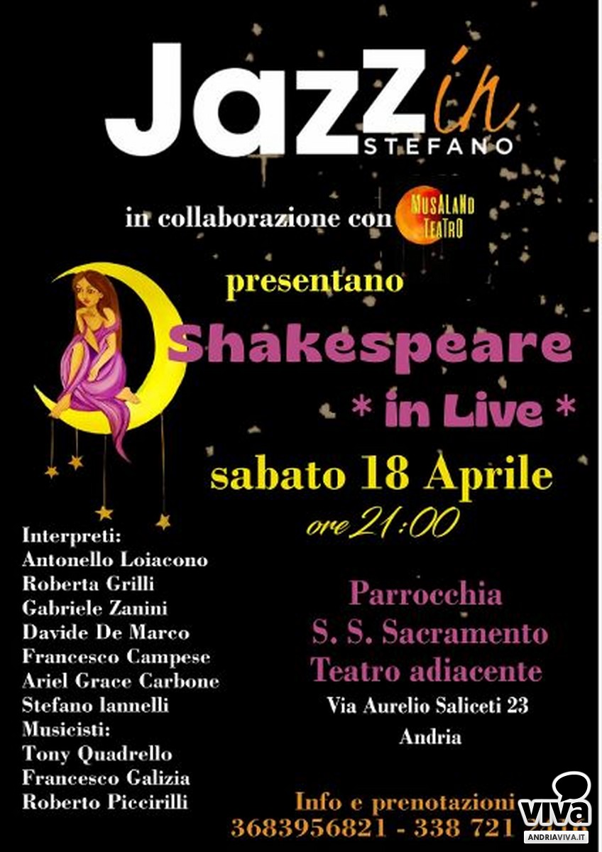 Sabato 18 aprile, alle ore 21, presso l'auditorium "Mons. Di Donna", in via Saliceti, adiacente alla parrocchia SS. Sacramento di Andria andrà in scena lo spettacolo "Shakespeare in Live", diretto dalla regista Roberta Grilli, un lavoro che unisce parola, musica e immaginazione, proposto dall'associazione Jazz in Stefano, di Stefano Porziotta, in collaborazione con Musaland teatro.