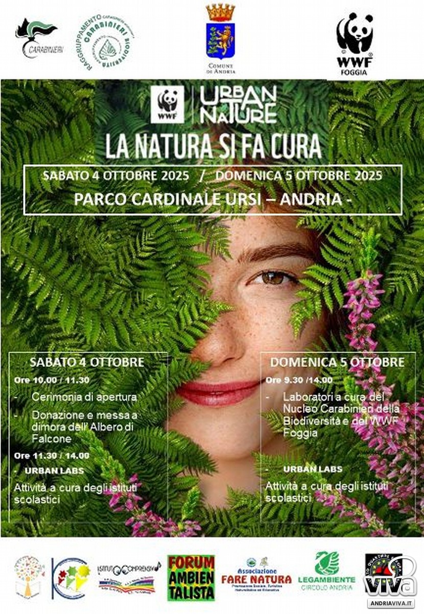 E' in programma oggi 4 e domenica 5 ottobre ad Andria l'evento per Urban Nature 2025, dal titolo "Urban Nature-La natura si fa cura", presso il Parco Cardinale Ursi, con l'obiettivo di valorizzare la biodiversità urbana e promuovere la consapevolezza ecologica.