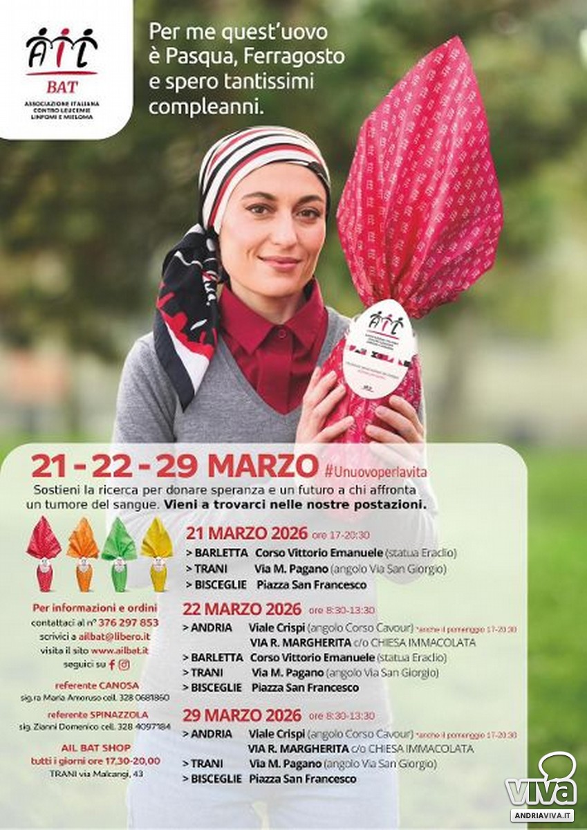 Un uovo di cioccolato che vale molto più di un simbolo pasquale. È quello proposto da AIL - Associazione Italiana contro Leucemie, Linfomi e Mieloma, che torna nelle piazze della provincia Bat con l'iniziativa "Un uovo per la vita", invitando i cittadini a sostenere concretamente la ricerca e l'assistenza ai pazienti affetti da tumori del sangue.