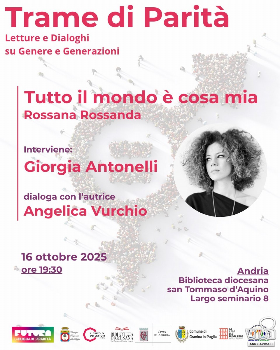Prende ufficialmente il via Trame di Parità – Letture e dialoghi su genere e generazioni, la rassegna culturale ideata dal Circolo dei Lettori di Andria APS e vincitrice del primo posto nella graduatoria regionale dell'Avviso Futura 2025, promosso dal Consiglio Regionale della Puglia – Commissione Pari Opportunità.